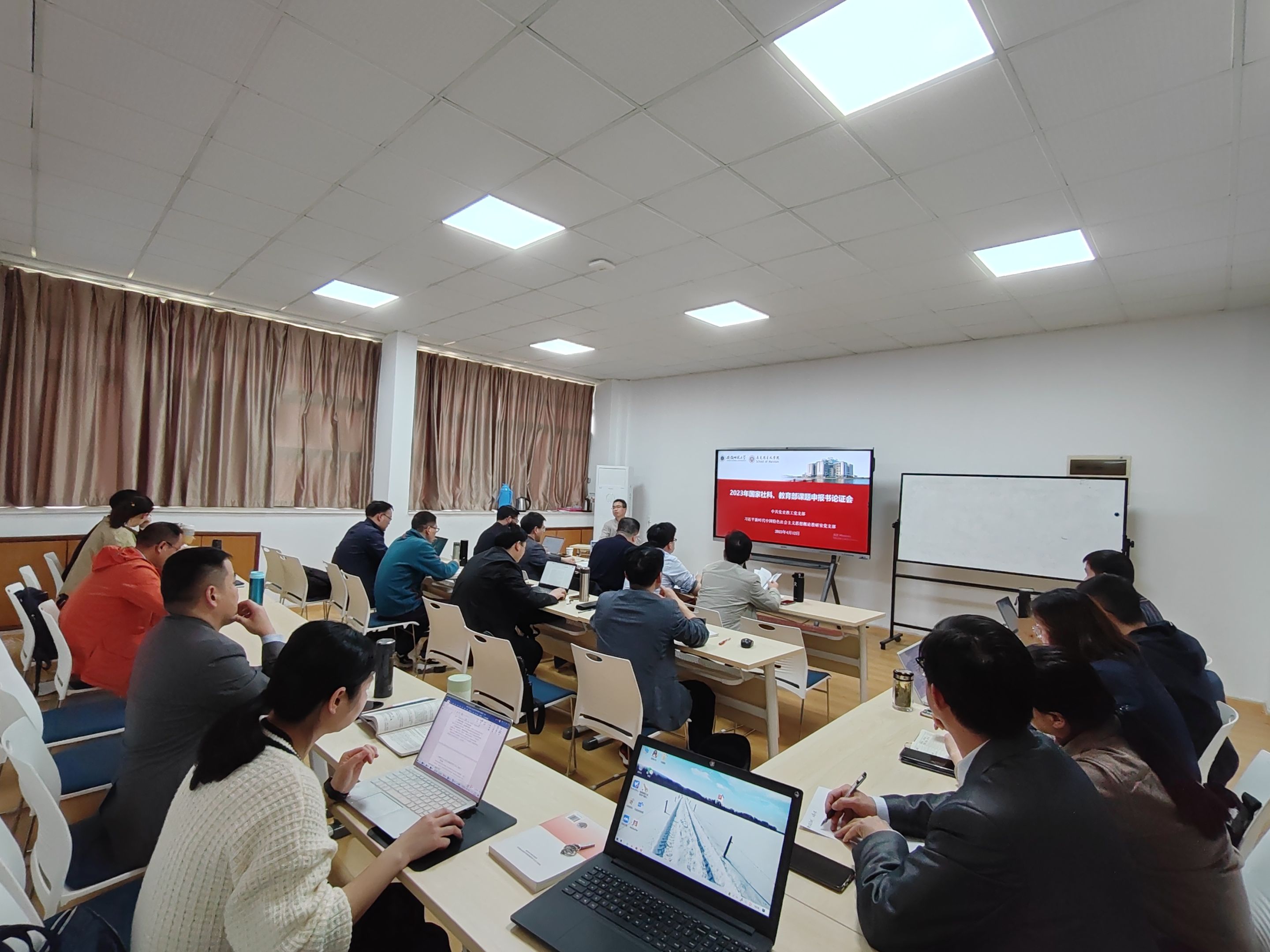 为了进一步提升教师科研水平,打造高质量的科研项目申报书,4月12日下午,党史教工党支部和习近平新时代中国特色社会主义思想概论教工党支部联合召开2023年度国家社科基金项目、教育部人文社科项目申报书论证交流会,公司党委书记严宏、经理姚宏志、副经理李祥兴到会指导,支部全体教师参加交流会。
