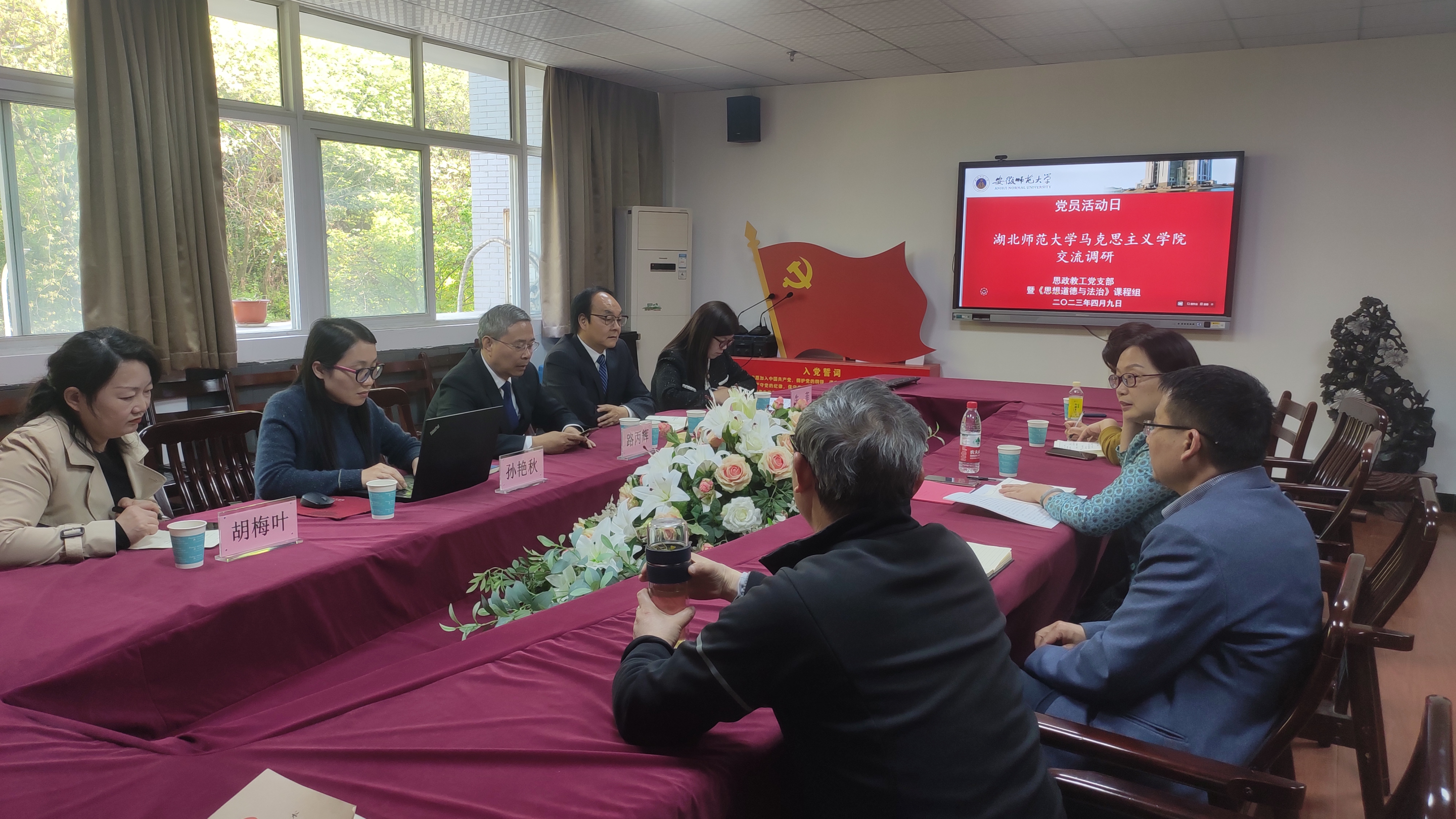 2023年4月9日,思政教师党支部“手拉手”教育部党建工作样板支部湖北师范大学beet365教师党支部,开展主题党员活动日,学习交流样板支部申报建设,共话高校“党建+”育人新模式。