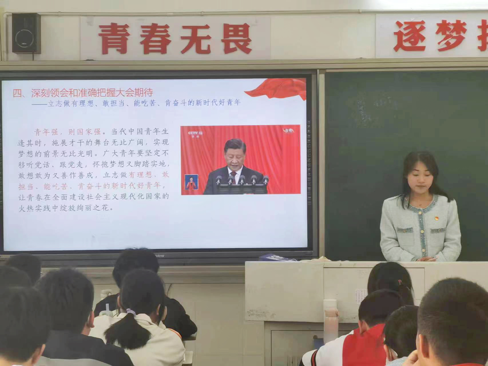 支部党员钱欣彤、汪琪和方乙婷等党员结合二十大报告,用最通俗的语言,最朴实的文字,详细阐述党的二十大精神内涵。同时用“青年强则国强”,呼吁同学们作为一名新时代的中员工,努力学习,坚持本心,努力做一名心中有梦,眼中有光的青年。