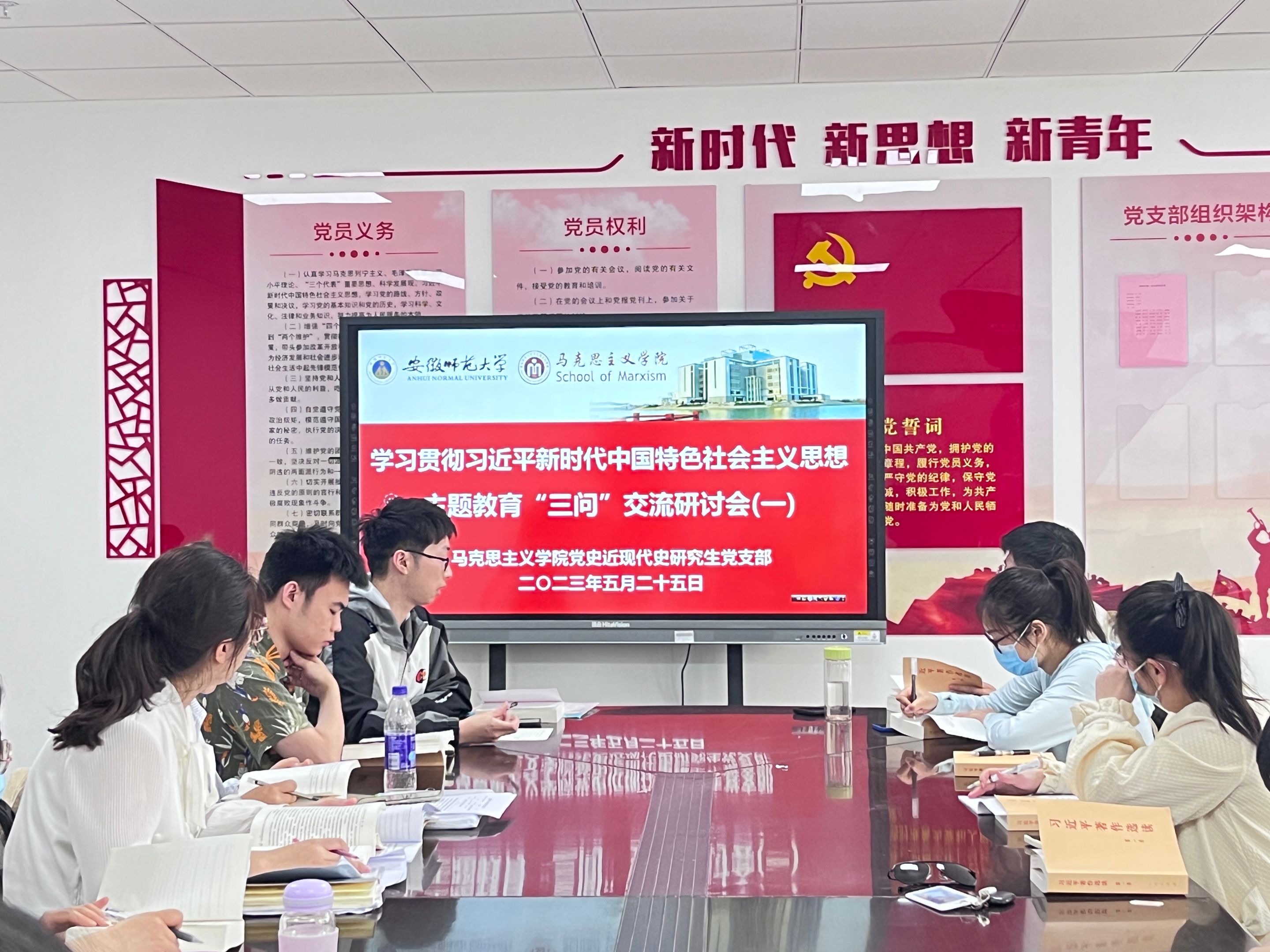 5月25日下午4点,党史近现代史研究生党支部在公司G215会议室召开“三问”专题交流研讨。活动由支部书记陶娴静主持,支部全体党员同志参会。