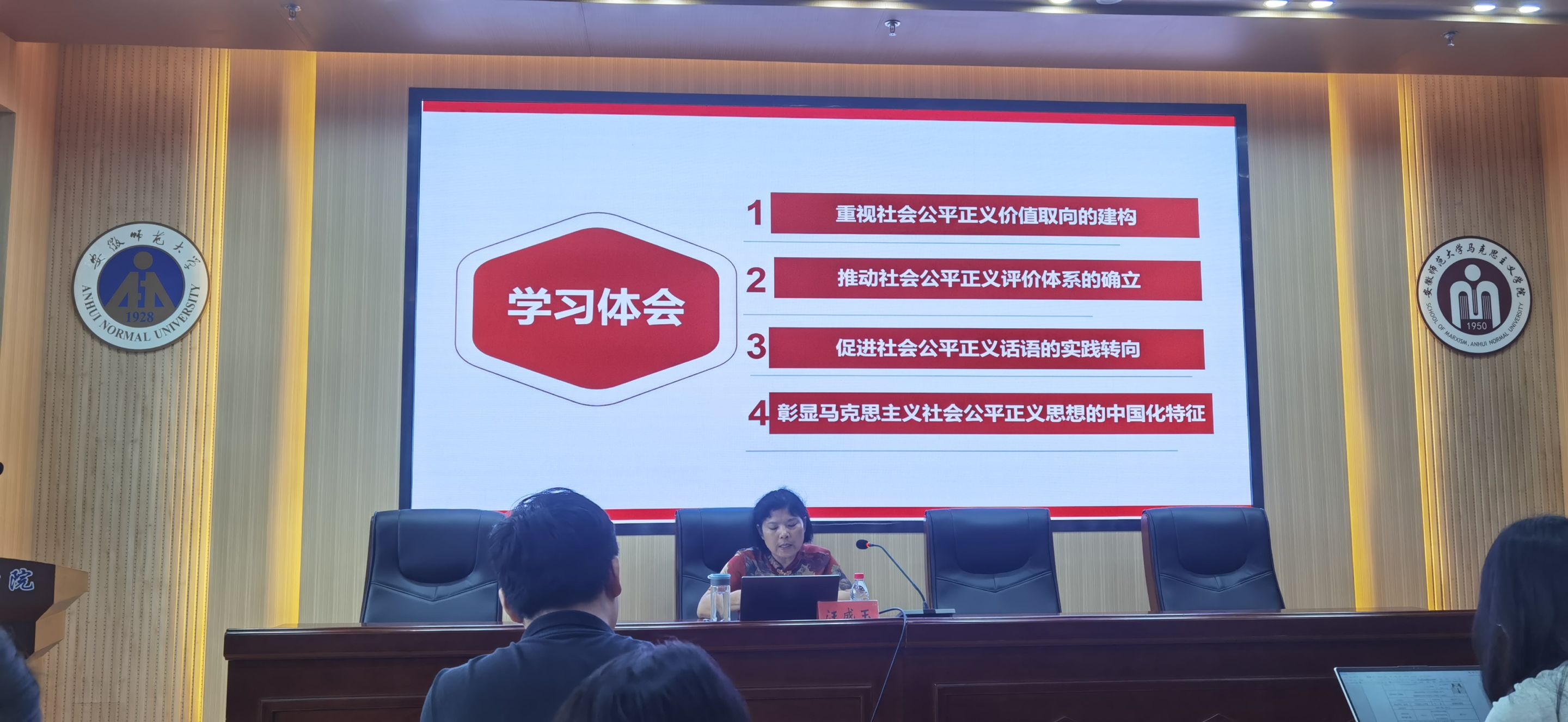 会上,汪盛玉首先介绍了《习近平著作选读》的出版情况和内容概况,选取重要篇目结合主要内容向大会作了说明。随后,她从“重视社会公平正义价值取向的建构”“推动社会公平正义评价体系的确立”“促进社会公平正义话语的实践转向”“彰显马克思主义社会公平正义思想的中国化特征”四个方面生动展开论述,从公平正义的研究角度,深入探讨了习近平新时代中国特色社会主义思想的科学性、整体性、时代性特征,强调了学习习近平新时代中国特色社会主义思想要讲究科学方法,逐句研读,认真体悟。