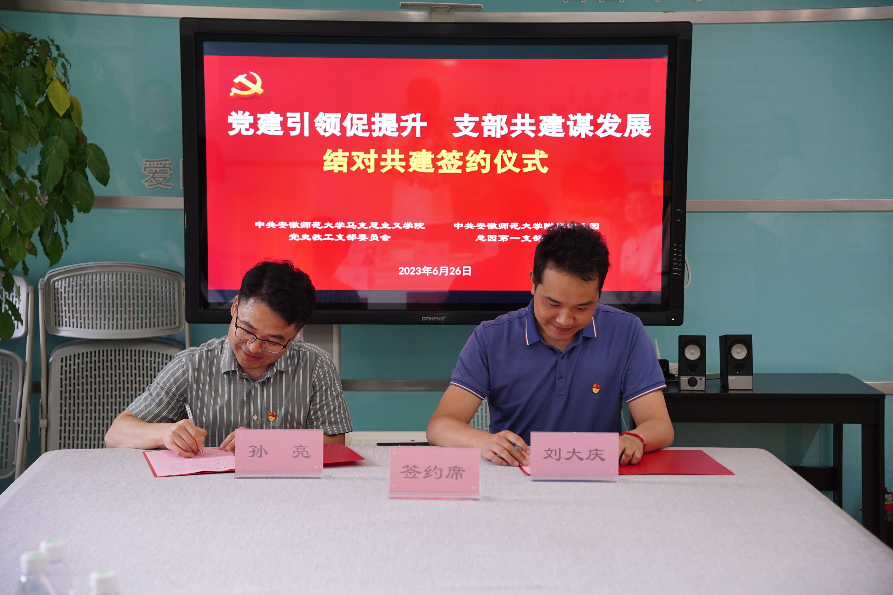 活动伊始,附幼总园第一支部书记刘大庆、第二支部书记徐莉,党史教工党支部书记孙亮先后介绍了本支部的基本情况以及主题教育以来各项任务工作的推进开展情况,并正式签署了《学习贯彻习近平新时代中国特色社会主义思想主题教育基层党支部结对共建协议》。
