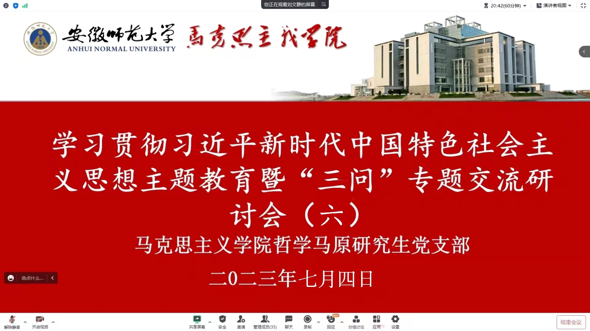7月4日上午,beet365哲学马原研究生党支部在腾讯会议开展学习贯彻习近平新时代中国特色社会主义思想主题教育暨“三问”交流研讨会。此次活动由支部书记张维欣主持,全体党员同志参加。