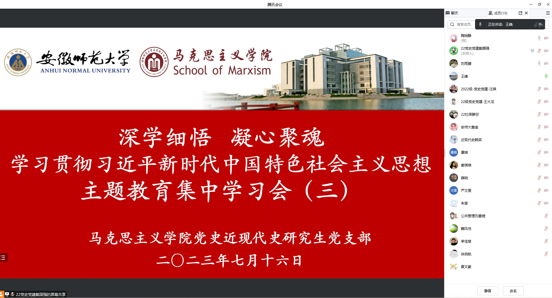 7月16日下午,党史近现代史研究生党支部在腾讯会议开展第三场主题教育集中学习会和“三问”交流研讨活动。此次活动由支部书记陶娴静主持,支部全体党员同志参加。