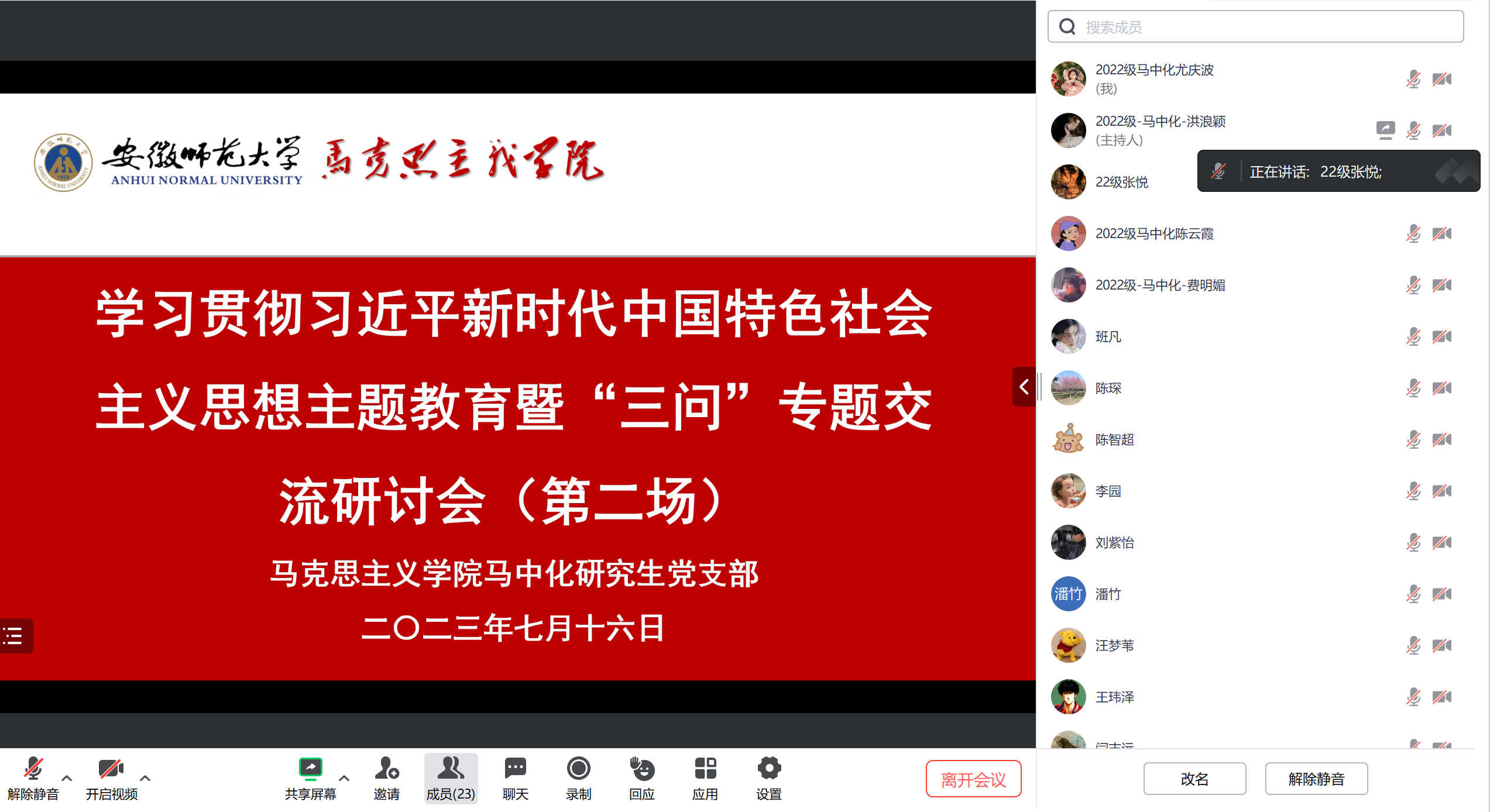 7月16日晚,马中化研究生党支部线上开展学习贯彻习近平新时代中国特色社会主义思想“三问”交流研讨会(第二场)。会议由支部组织委员洪浪颖主持,支部全体党员同志参加。