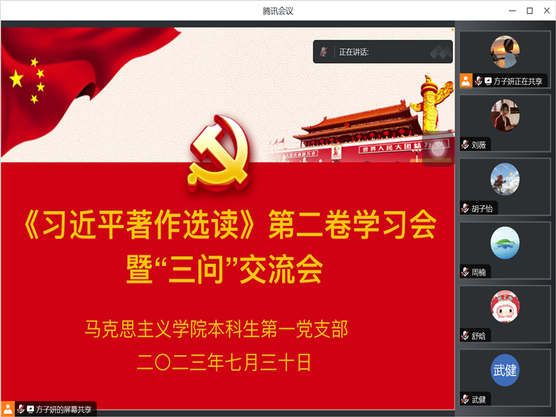 7月30日晚,本科生第一党支部线上开展《习近平著作选读》第二卷学习会暨“三问”交流会。此次活动由支部纪检委员方子妍主持,全体党员同志参加。