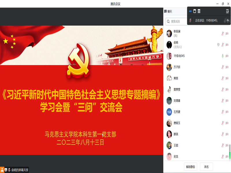 8月13日晚,beet365本科生第一党支部在腾讯会议开展《习近平新时代中国特色社会主义思想专题摘编》学习会暨“三问”交流会。此次活动由俞晓同学主持。