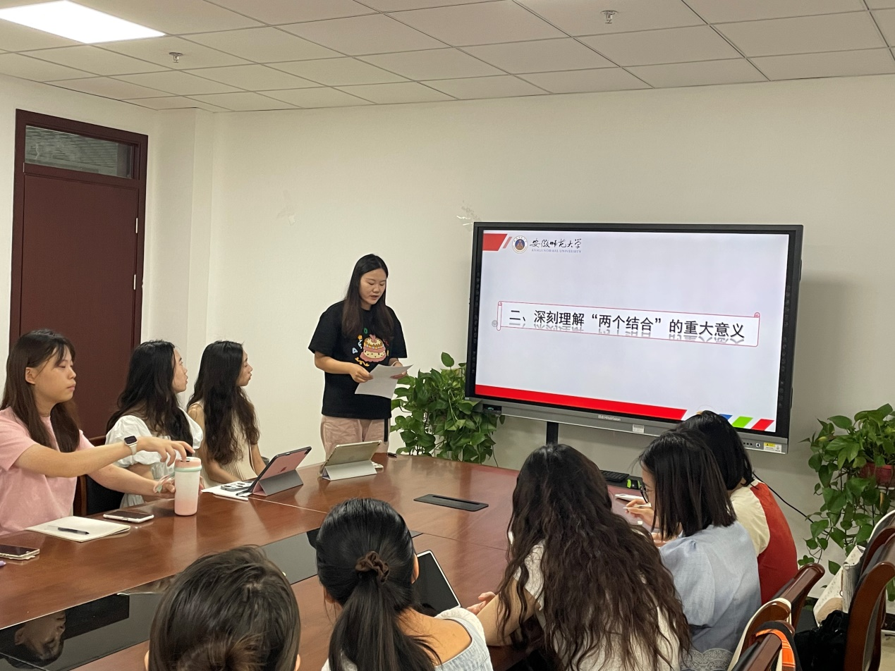 党支部胡冰、郭艳芳、欧阳竹影同志结合自身的学习情况和实践,通过自身的学习感悟,带领我们学习了习近平总书记在文化传承发展座谈会上的讲话。首先,胡冰同志指出我们要深刻把握中华文明的突出特征,领会中华文明突出的连续性、创新性、统一性、包容性、和平性。其次,郭艳芳同志带领我们学习如何深刻理解“两个结合”的重大历史意义。习近平总书记从“两个结合”的前提是彼此契合、“结合”的结果是互相成就、“结合”筑牢了道路根基、“结合”打开了创新空间和“结合”巩固了文化主体性五个方面对“两个结合”的重大意义做出深刻阐释。最后,欧阳竹影同志从“更好担负起新的文化使命”向大家具体阐释了更好担负起新的文化使命的三个着力点。