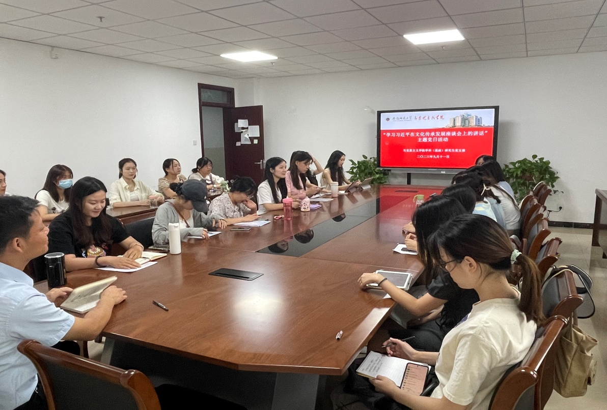9月11日上午,学科(思政)研究生党支部在公司二楼211会议室开展了“学习习近平总书记在文化传承发展座谈会上的讲话”主题党日活动,本次党日活动由支部书记夏盼盼主持,支部全体党员参加。