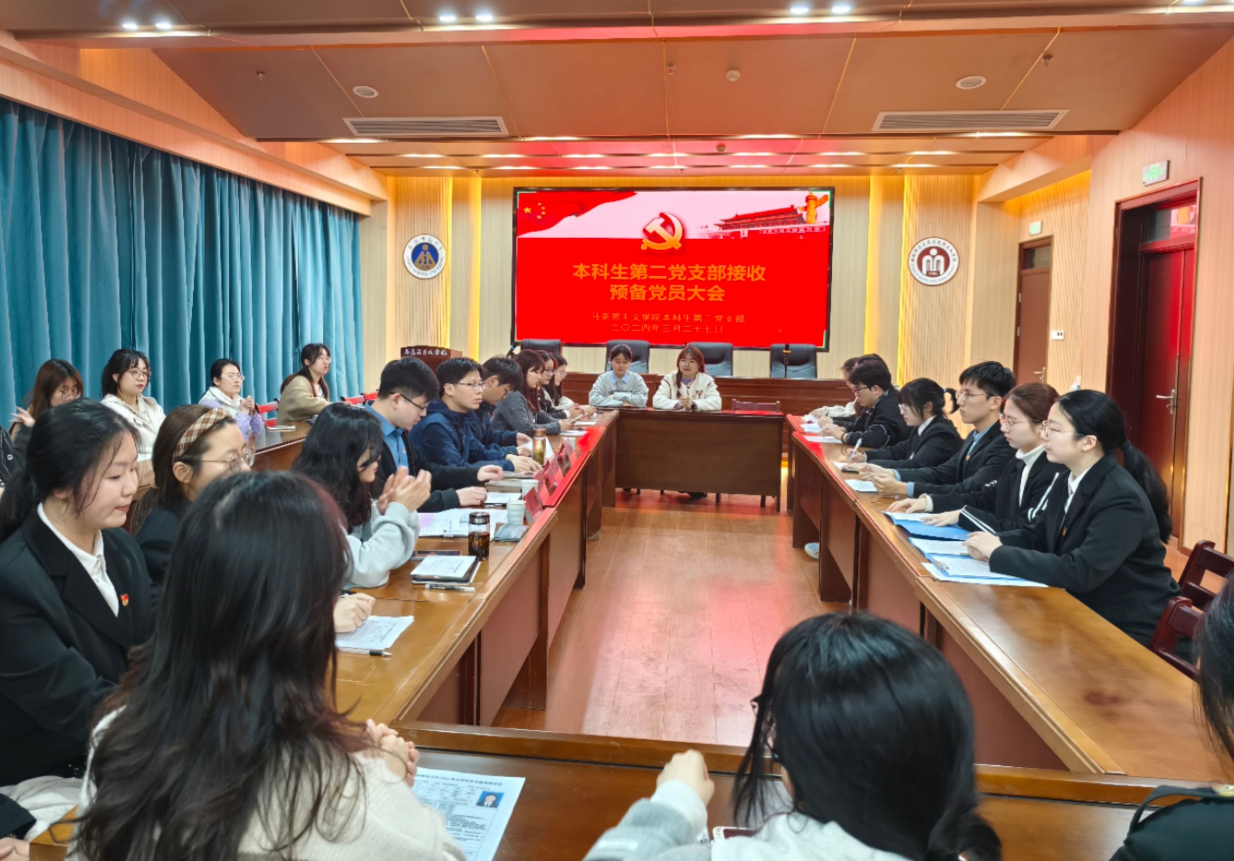 会上,王东从对党的认识、入党动机、本人履历、家庭和主要社会关系情况,以及需要向党组织说明的问题展开汇报。入党介绍人沈镇、汪琪介绍王东的有关情况,并对其能否入党表明肯定意见。沈镇代表支委会向大会报告对发展对象的审查情况;与会党员对王东能否入党进行充分讨论;俞晶晶等党员从思想、生活和学习等方面对王东作相关评价。讨论结束后,王东针对与会党员所提意见表态发言。随后,支部大会采取无记名投票的方式对王东能否入党进行表决。投票结束后,季行健宣读支部党员大会决议,同意接收王东为中共预备党员。王东、杨蕊、张宇涵和杨璇共4名发展对象按规定流程被党组织接收为中共预备党员。
