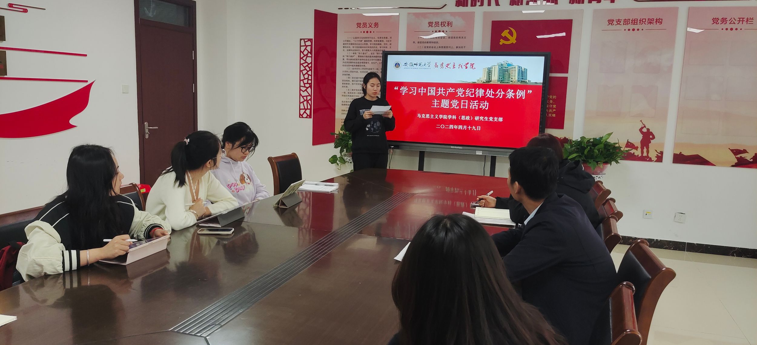 4月19日上午,学科(思政)研究生党支部在公司二楼215会议室开展了“学习《中国共产党纪律处分条例》”主题党日活动,本次党日活动由支部书记夏盼盼主持,支部全体党员参加。