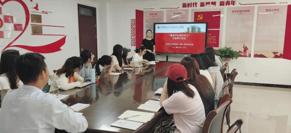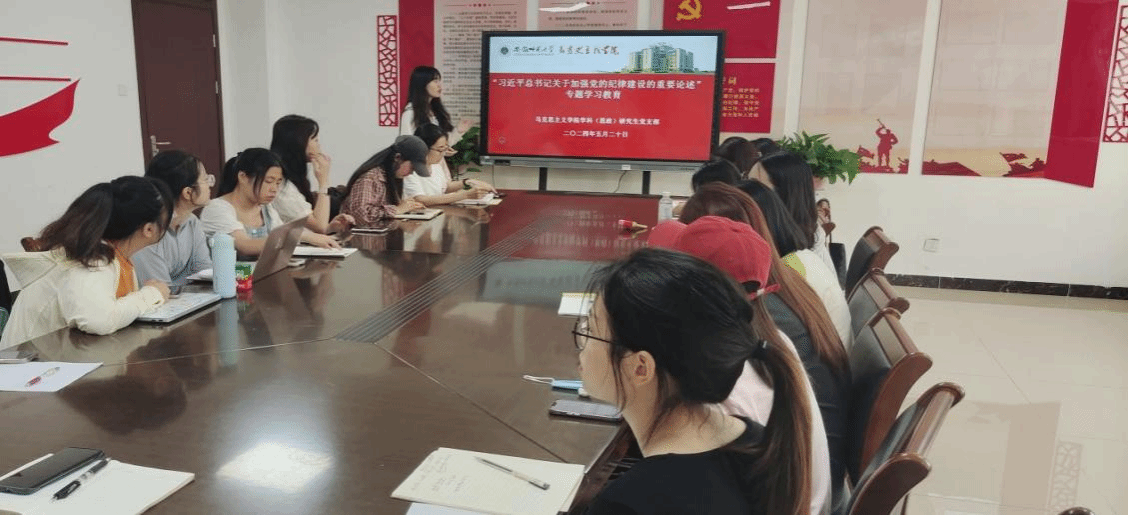 为了加强毕业生党员教育管理,学科(思政)研究生党支部于五月底至六月初围绕习近平总书记关于全面加强党的纪律建设的重要论述、遵规守纪、志愿服务等主题开展了毕业生专题系列学习活动,本次专题系列学习活动由支部书记夏盼盼主持,支部全体党员参加。