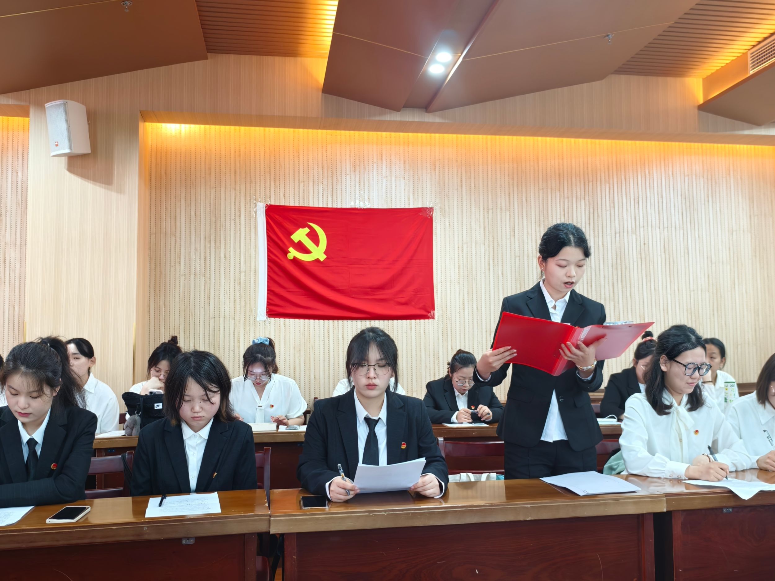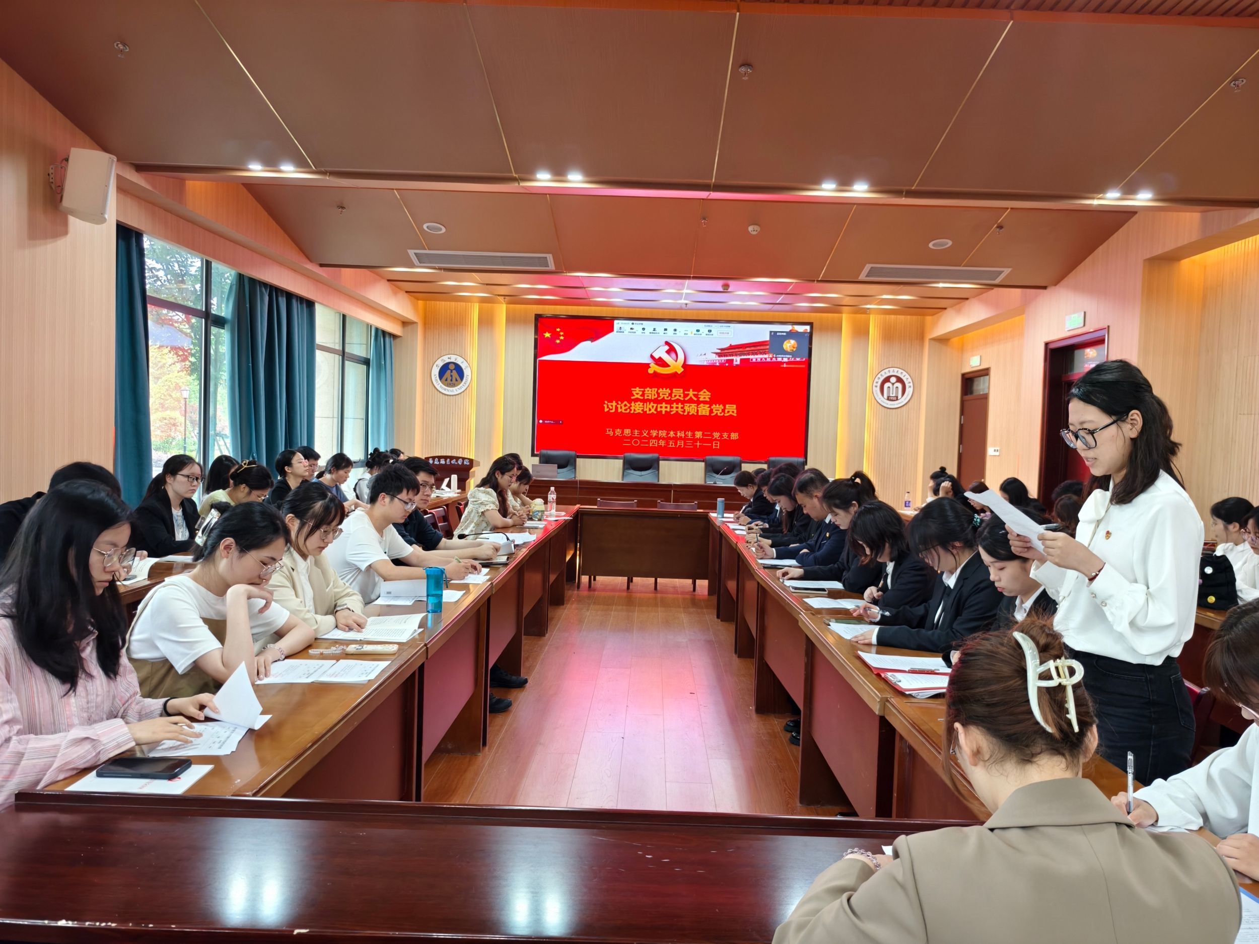 会上,桂诗洁从对党的认识、入党动机、本人履历、家庭和主要社会关系情况,以及需要向党组织说明的问题展开汇报。入党介绍人季行健、周勤松介绍桂诗洁的有关情况,并对其能否入党表明肯定意见。沈镇代表支委会向大会报告对发展对象的审查情况;与会党员对桂诗洁能否入党进行充分讨论;焦紫涵等党员从思想、生活和学习等方面对桂诗洁作相关评价。讨论结束后,桂诗洁针对与会党员所提意见表态发言。随后,支部大会采取无记名投票的方式对桂诗洁能否入党进行表决。投票结束后,季行健宣读支部党员大会决议,同意接收桂诗洁为中共预备党员。桂诗洁等15位发展对象按规定流程被党组织接收为中共预备党员。