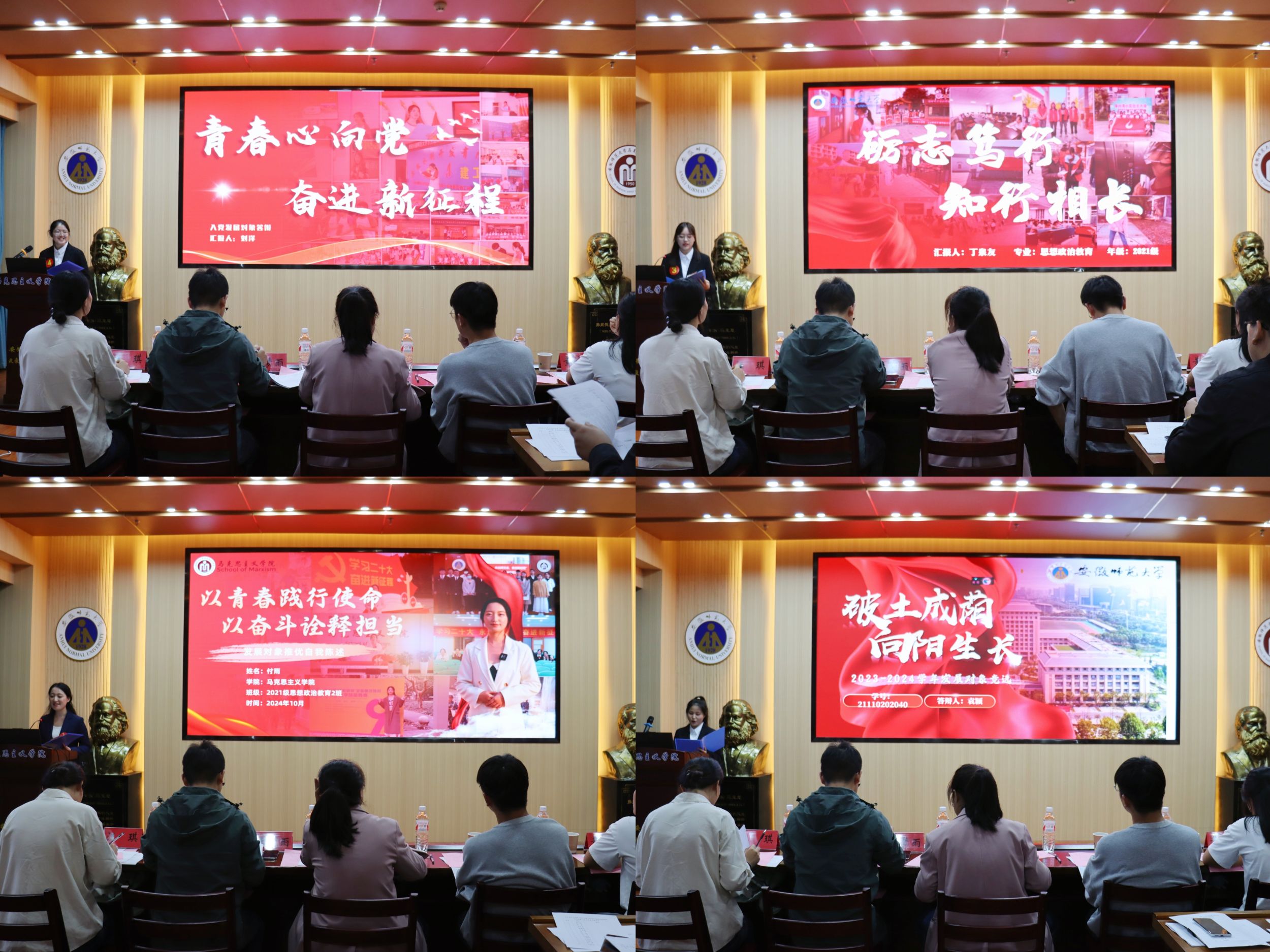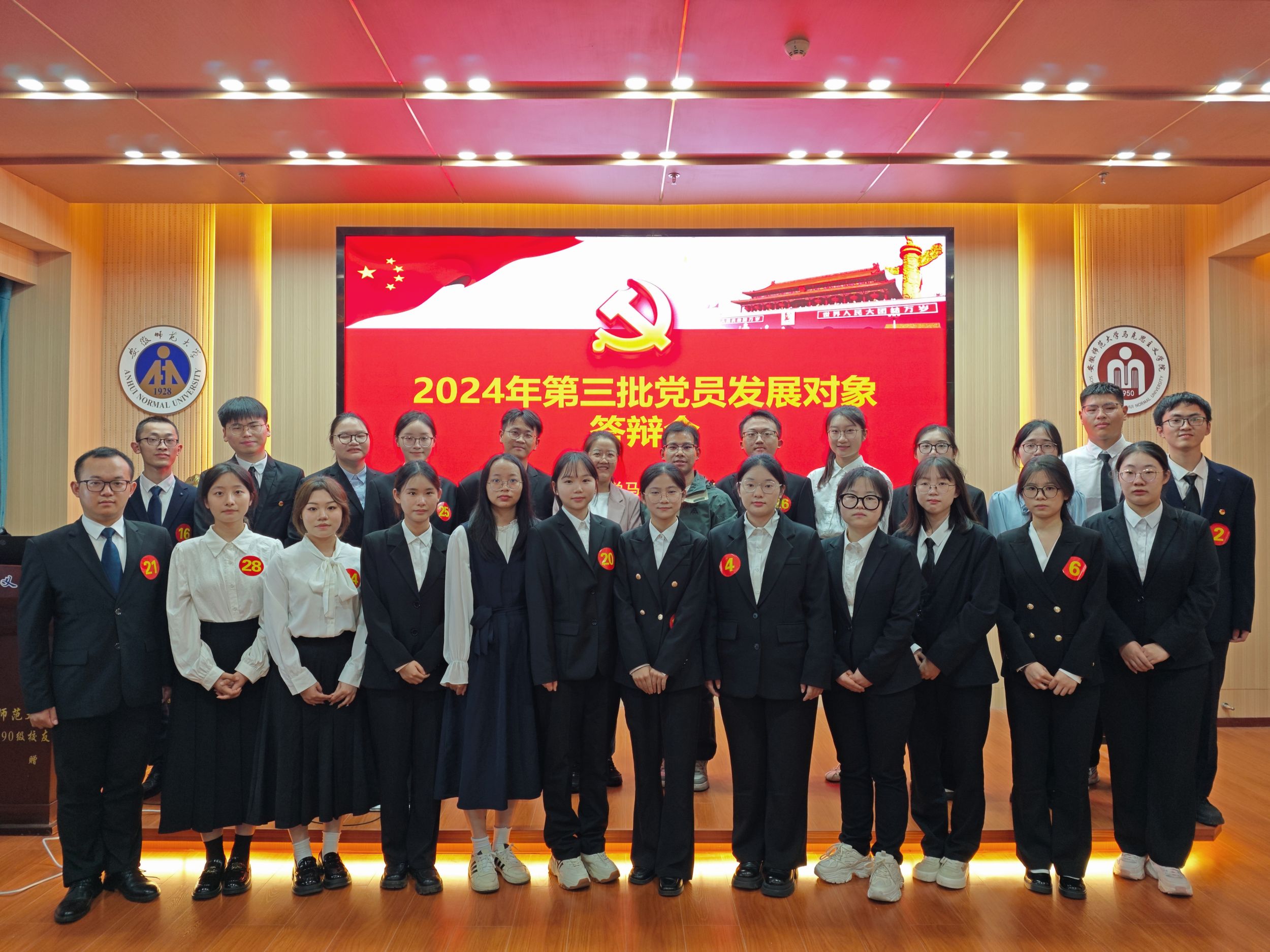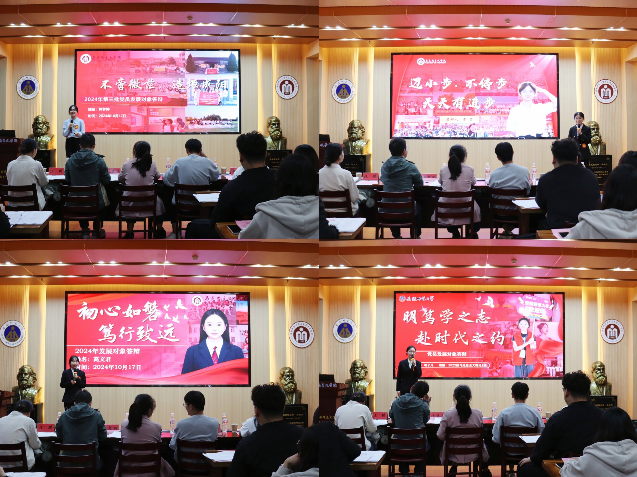为进一步提高党员发展质量,10月17日晚,本科生党支部在文典楼G108报告厅举行2024年第三批党员发展对象答辩会。本科生第二党支部书记王梦雨、2022级本科生辅导员沈镇、2022级本科生辅导员陶娴静以及各支部组织委员担任本次答辩会的评委,12位同学担任员工代表评委,部分入党积极分子观摩学习。