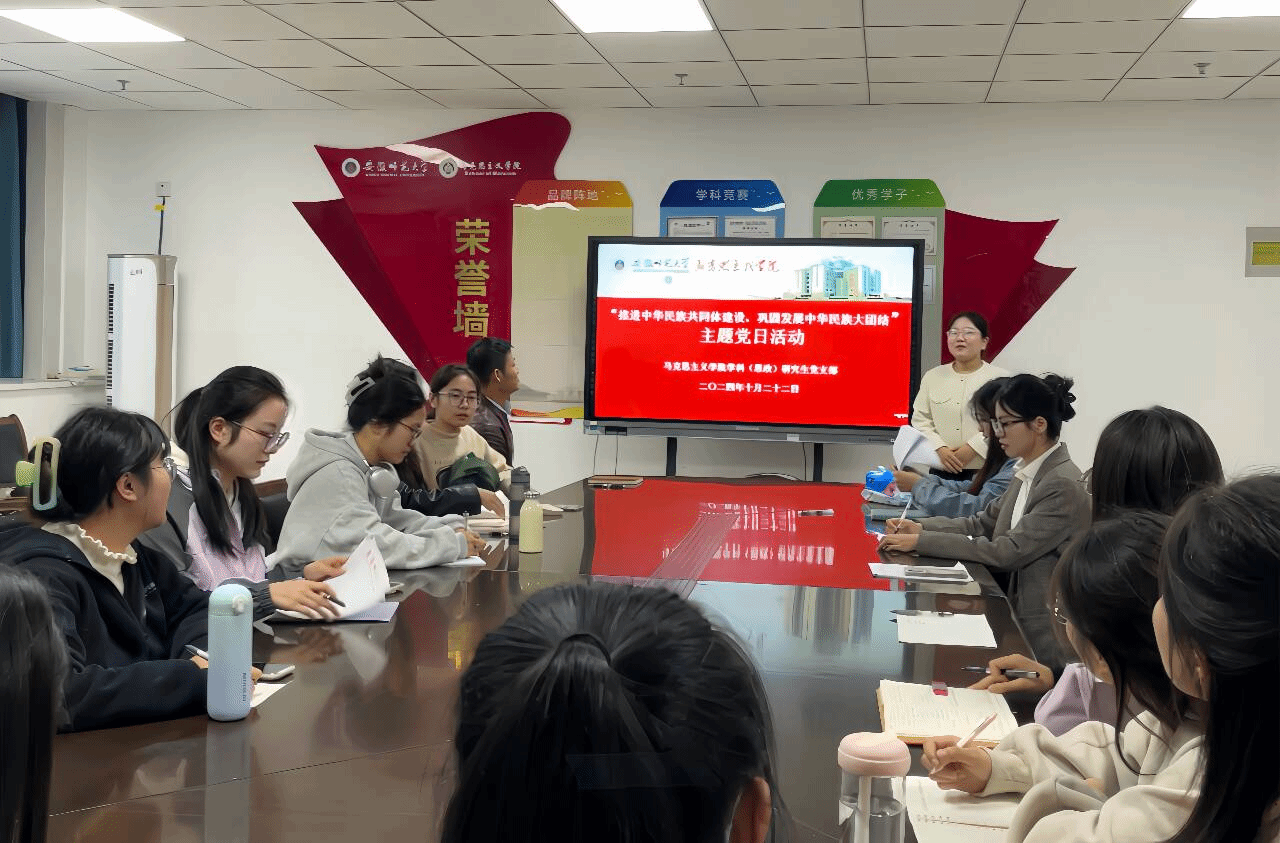 为了深入学习和贯彻习近平总书记在全国民族团结进步表彰大会上的重要讲话,10月22日下午,学科(思政)研究生党支部在公司G215会议室开展“推进中华民族共同体建设,巩固发展中华民族大团结”主题党日活动,此次党日活动由高梦冉主讲,支部全体党员参加。