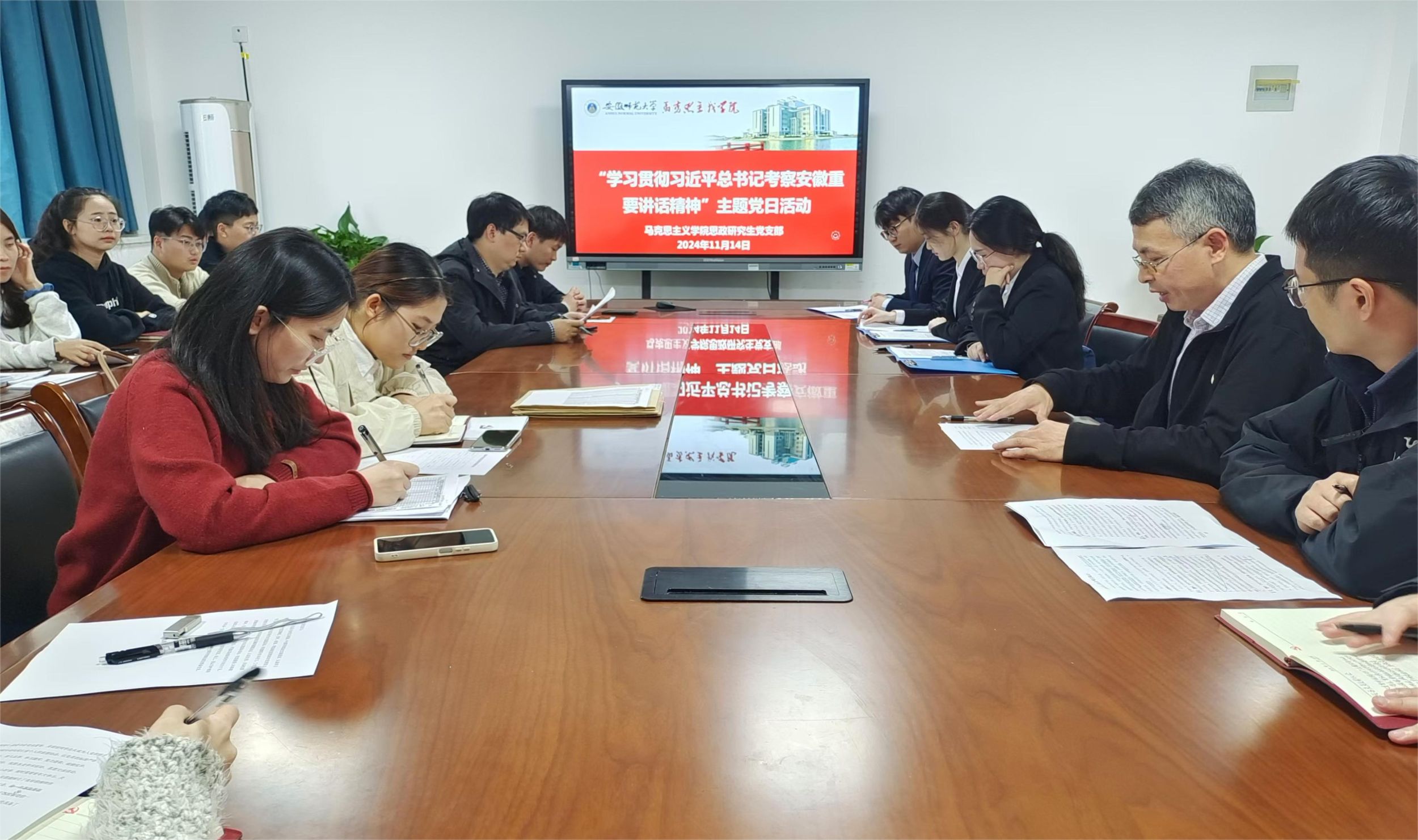 2024年11月14日下午,思政研究生党支部于beet365二楼G211室开展“学习贯彻习近平总书记考察安徽重要讲话精神”的主题党日活动。本次会议由支部书记陈冬冬主持,邀请黄江、吴建军两位党员分享“学习贯彻习近平总书记考察安徽重要讲话精神”学习心得,支部全体党员同志参加。