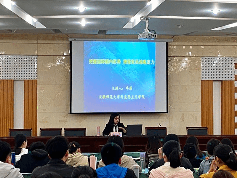 牛菲从“构”之一字入手,就社会存在的一些偏见引入本次党课的内容,随后围绕全球经济形势观察、国际关系新动向和在不确定性中保持战略定力三个方面分别进行细致讲解。在全球经济形势方面,她指出全球经济重心已转移到太平洋地区,在经济重心转移之际,中国的经济发展迅猛,引领全球经济发展,并重点分析了在疫情之后中国经济迅速回暖的原因和与西方的差别。对于国际关系的新动向,她通过大量的生动事例,重点围绕美俄关系、中美关系进行了深入的阐释。最后,她从战略信念,战略心态等方面讲述如何保持和提高战略定力,鼓励同学们要胸怀远大理想、热爱伟大祖国、坚定不移跟党走。