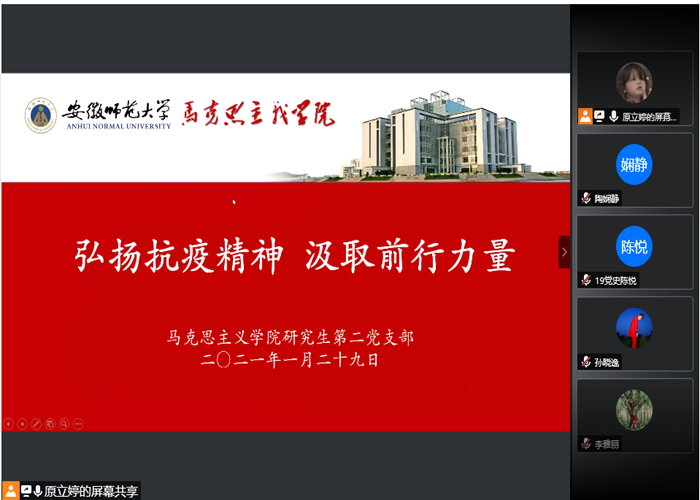 本网讯(文/图 赵文能)1月29日晚,研究生第二党支部通过腾讯会议开展“弘扬抗疫精神,汲取前行力量”线上主题党日活动,活动由支部组织委员原立婷主持,全体党员同志参加。