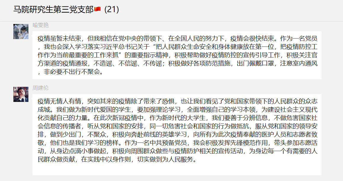首先,主持人用PPT形式向大家列举了党和国家在疫情防控方面所采取的重大举措,在全国上下和广大人民群众共同努力下,当前我国疫情防控态势向好,社会秩序稳定,经济持续发展。随后,大家共同观看了视频《回顾中国抗疫这一年》,视频充分展现了中国在这场疫情大考中的强大领导力、凝聚力以及负责任的大国形象。观看视频后,大家以文字的形式进行了心得交流和分享,党员们纷纷认为通过此次活动,对疫情有了更清醒的认识,也更加坚定了战胜疫情的信心和决心,并表示在今后的学习和工作中将更加勤奋努力,充分发挥党员先锋模范作用。