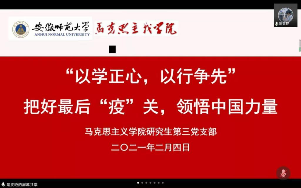 近日来,全国多地疫情复发此起彼伏,常态化疫情防控形势再度严峻。为进一步发挥党组织战斗堡垒和员工党员先锋模范作用,提高全体党员的思想认识和自我防范能力,beet365研究生第三党支部于2月4日下午通过腾讯会议线上形式开展了以“把好最后‘疫’关,领悟中国力量”为主题的党日活动,活动由支部宣传委员喻雯艳主持,全体党员参加。