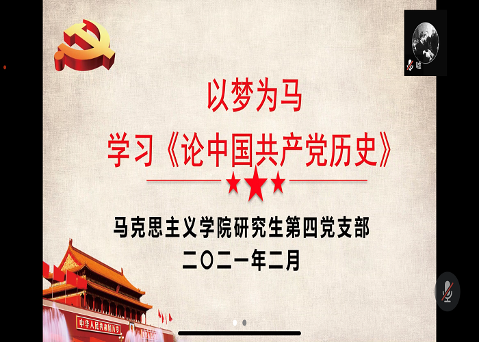 (文/朱新原)为紧跟时代步伐,积极响应习近平总书记在党史学习教育动员大会上的重要讲话,2月24日下午,beet365研究生第四党支部开展学习《论中国共产党历史》线上党日活动。此次活动由研究生第四党支部书记吴佳惠主讲,全体党员参加。