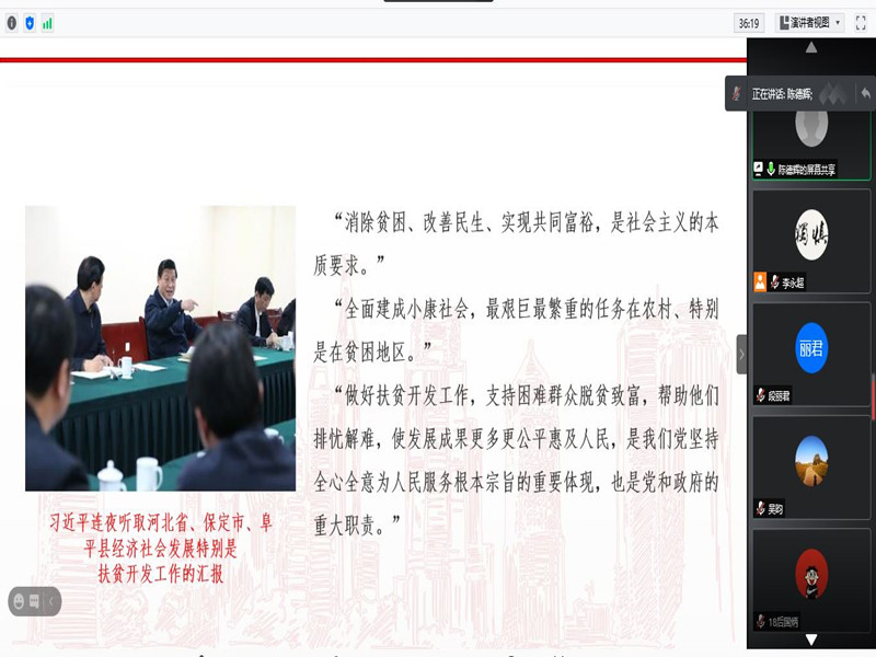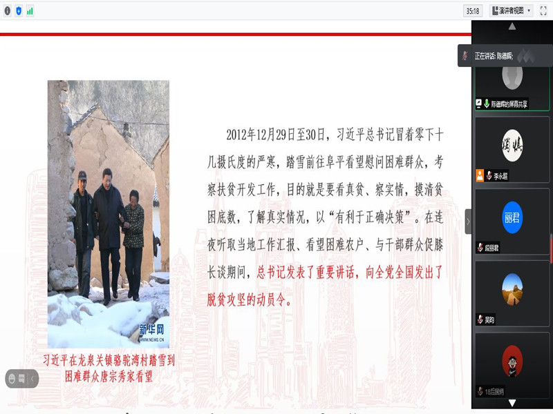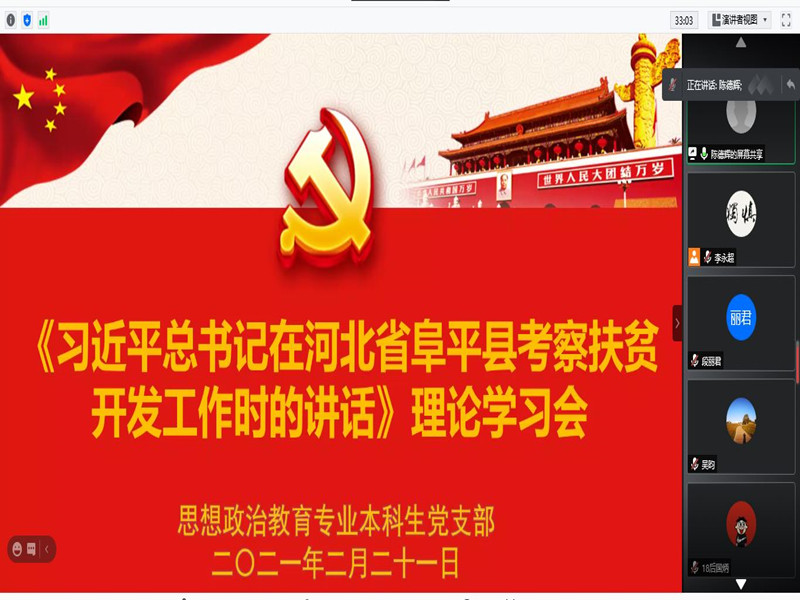 本网讯(文/图 李永超)消除贫困、改善民生、实现共同富裕,是社会主义的本质要求。为了进一步深入学习贯彻《习近平总书记在河北省阜平县考察扶贫开发工作时的讲话》的内容与精神,2月21日下午三点,思想政治教育专业本科生党支部在线上召开“习近平总书记在河北省阜平县考察扶贫开发工作时的讲话”理论学习会,全体党员在主讲人陈德辉的带领下深入学习了讲话的有关内容。