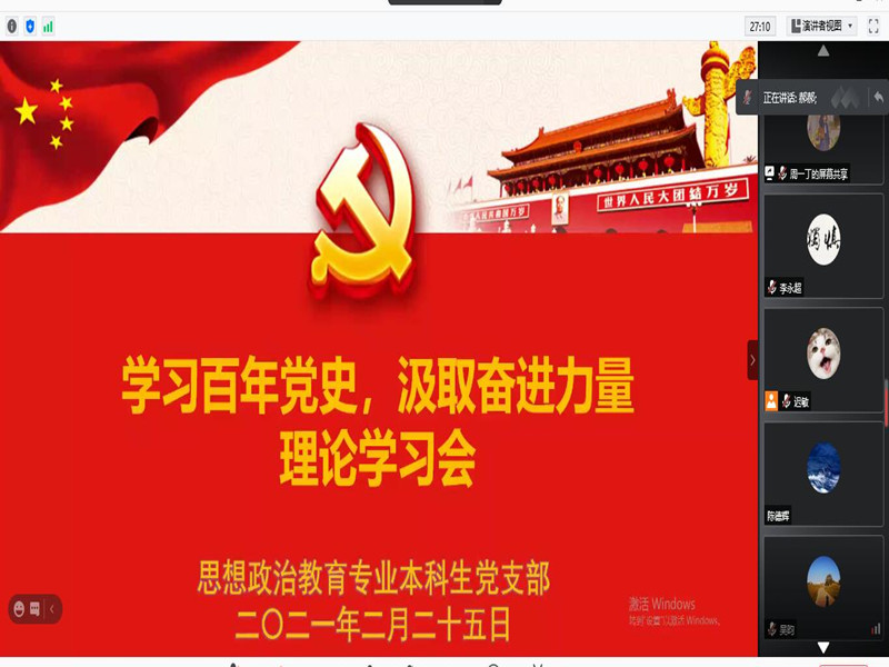 本网讯(文/图 迟敏)历史是最好的教科书,学习党史、国史是坚持和发展中国特色社会主义,把党和国家各项事业继续推向前进的必修课。为了进一步深入学习贯彻习近平总书记在党史学习教育动员大会上的重要讲话,2月25日晚上七点,思想政治教育专业本科生党支部在线上召开“学习百年党史,汲取奋进力量”理论学习会,全体党员在主讲人郝明云的带领下深入学习了讲话的有关内容。