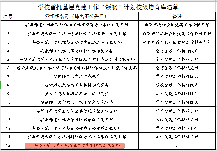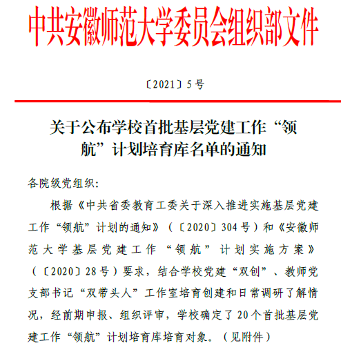 在首次获批的20个首批基层党建工作“领航”计划培育库培育对象中,有14个培育对象在前期已先后获批教育部、安徽省和公司党建工作样板支部或党建工作标杆院系,思政教工党支部与这些党组织同批入选基层党建工作“领航”计划培育库,也说明了思政教工党支部长期以来的扎实工作得到了公司和公司的认可与肯定。