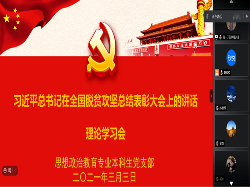 本网讯(文/图 陈欣悦)近日,思想政治教育专业本科生党支部全体党员集中学习习近平总书记在全国脱贫攻坚总结表彰大会上的讲话。活动由主讲人周一丁主持。