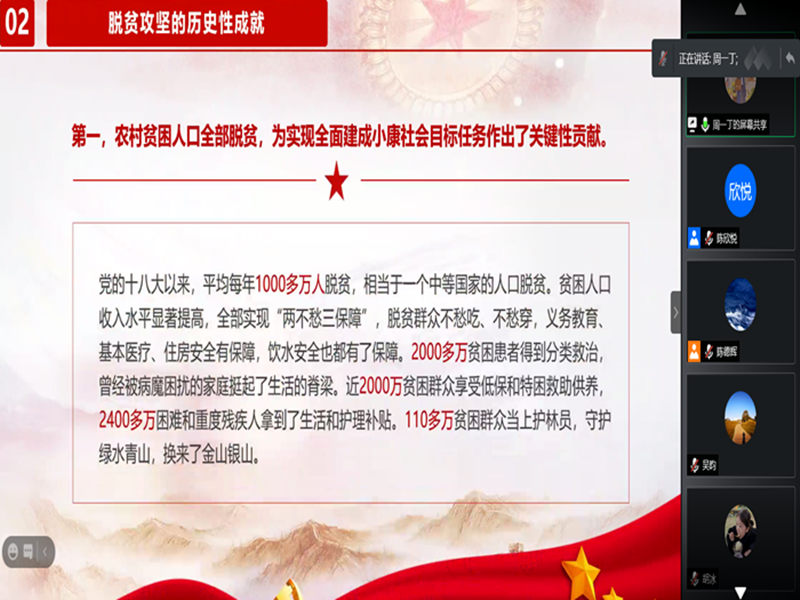 周一丁从脱贫攻坚战的全面胜利、脱贫攻坚的历史性成就、中国特色减贫道路、中国特色反贫困理论、脱贫攻坚精神五个方面带领大家深入学习。他还分享了黄文秀的光荣事迹,号召全体党员向黄文秀学习,将人民群众放在心中,真正做到“功成不必在我,功成必定有我”。