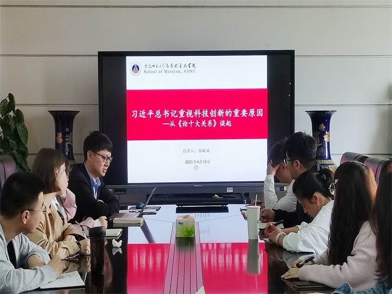 本网讯(beet365)4月15日下午,研究生第三党支部邀请博士生党员胡啟斌在公司四楼会议室主讲“习近平总书记重视科技创新的重要原因”。支部全体党员和新一批入党积极分子参加了本次活动。