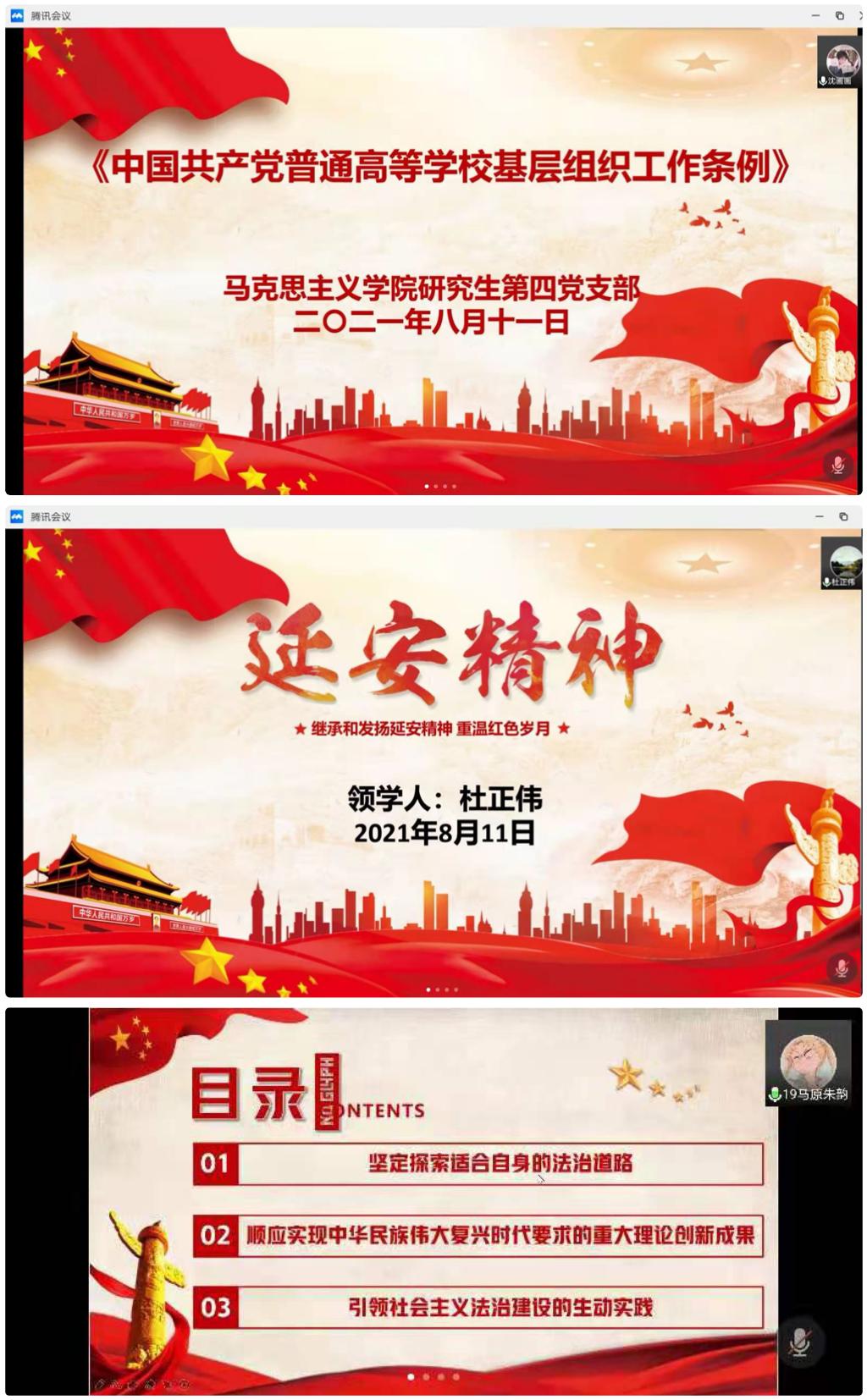 本网讯(文/图 朱新原)8月11日晚,研究生第四党支部通过腾讯会议开展以“学习党史,礼赞百年”为主题的党日活动。此次活动由支部组织委员沈画画主持,全体党员参加。