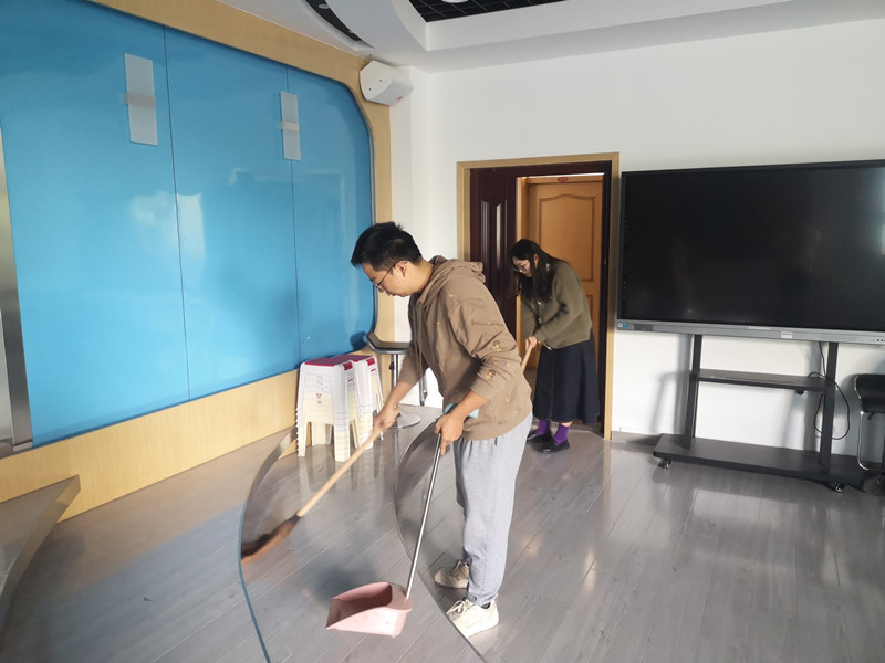 员工党员准时来到实践活动场地,按提前分配的打扫任务开启了忙碌的清理工作,大家充分发扬了不怕苦、不怕累的精神,对会议室及图书资料室等区域进行了清洁。全体党员分工协作,显示出了饱满的热情和积极的状态,大家以高要求、高标准打扫完自己所负责的领域。大家的努力为公司增添了一份清净与明朗,得到了老师和同学们的一致好评。