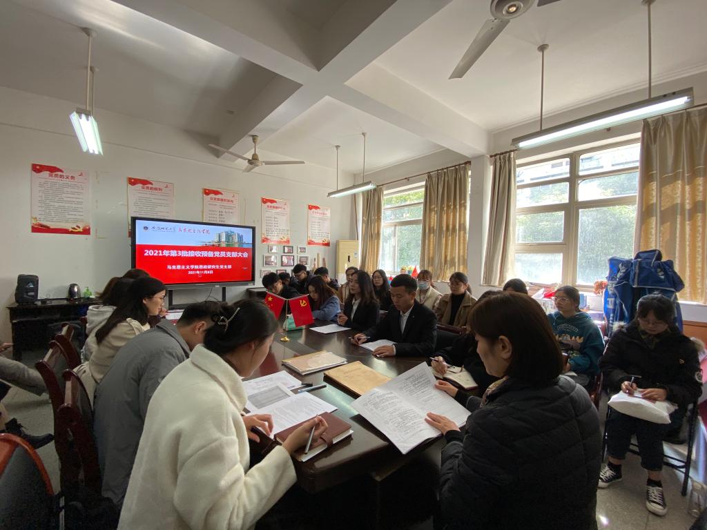 会上,雷长稳从对党的认识、入党动机、本人履历、家庭和主要社会关系情况,以及需要向党组织说明的问题作出汇报。入党介绍人汪翠萍、邓敏介绍雷长稳的有关情况,并对其能否入党表明肯定意见。邓敏代表支委会向大会报告对发展对象的审查情况;与会党员对其能否入党进行充分讨论;王晨等3名党员从思想、生活和学习等方面对其作相关评价。支部大会采取无记名投票的方式对其能否入党进行表决。投票结束后,支部书记齐永佳宣读支部党员大会决议,同意接收雷长稳为中共预备党员。雷长稳针对与会党员所提意见做表态发言。徐猛香也按照上述程序被党组织接收为中共预备党员。