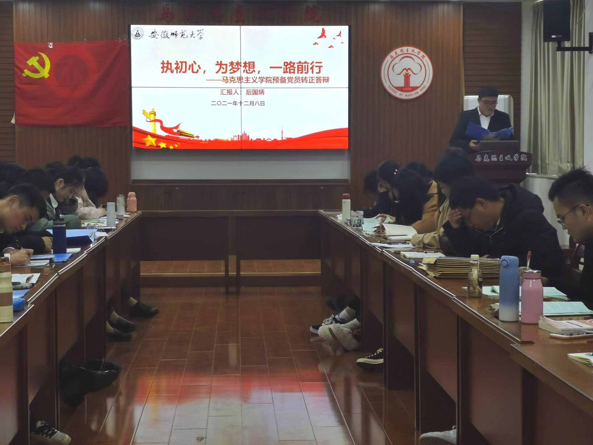 本网讯(文/费常虹 摄/崔航)12月8日上午,思想政治教育专业本科生党支部在公司五楼召开支部大会,讨论中共预备党员转正相关事宜。公司分党校班主任、本科生党支部书记周楠,公司组织员、本科生党支部纪检委员夏盼盼出席会议。