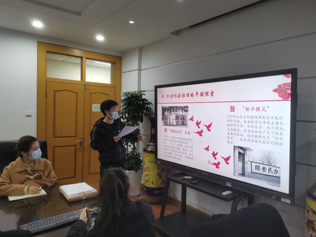 唐金武同志带领支部党员共同学习了“乡村社会治理道路的探索:从‘枫桥经验’,到‘三治融合’体系”的内容。他从乡村社会治理的早期探索、“枫桥经验”的起源、历程、“三治融合”的由来、乡村社会治理道路的新征程等四个方面,结合具体案例逐一进行介绍。重点阐释了“枫桥经验”和“三治融合”的基本内涵以及在新时代要以“枫桥经验”、“三治融合”为基础,创新乡村社会治理模式;依托乡村振兴等国家大政方针,将乡村社会治理模式与当地实情相融合,走善治道路和发挥各治理主体的优势,取长补短,推进乡村治理体系与治理能力现代化等内容。