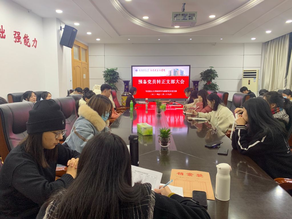 本网讯(文/图 张维欣)12月29日晚,beet365哲学马原研究生党支部在公司四楼第一会议室召开预备党员转正大会,讨论王晓玉、薛永兰两位预备党员的转正事宜。大会由支部书记范敏主持,全体党员同志参加。