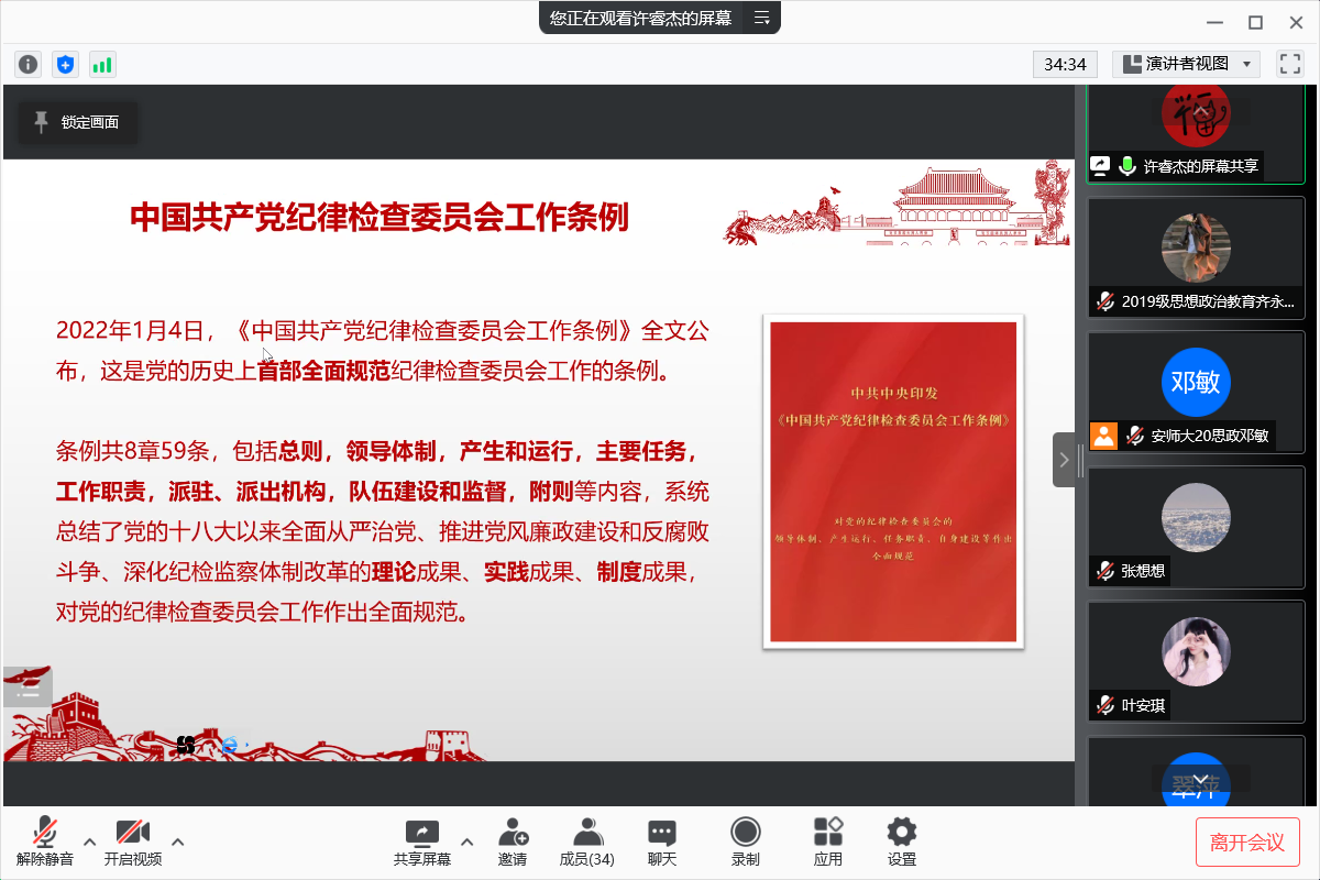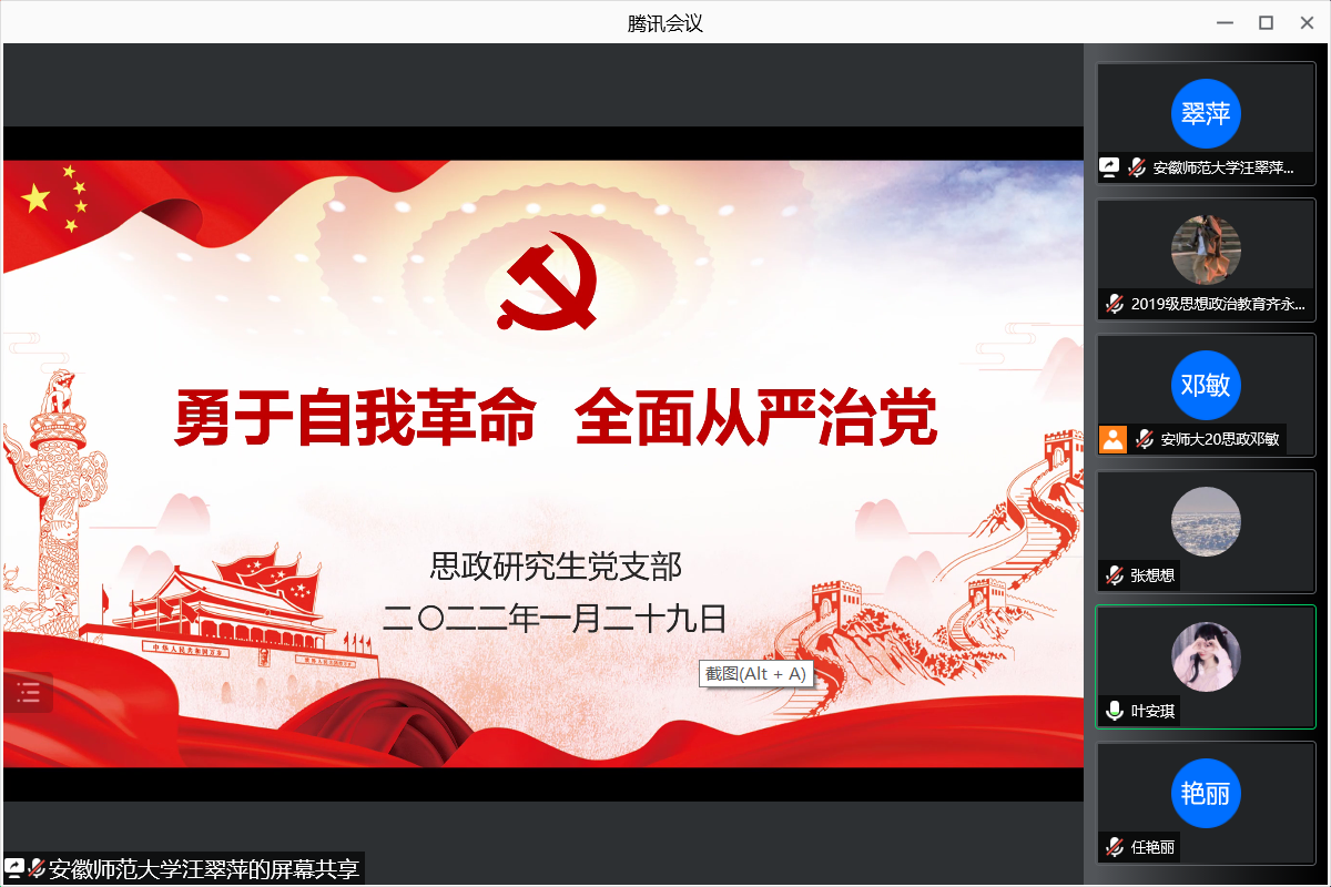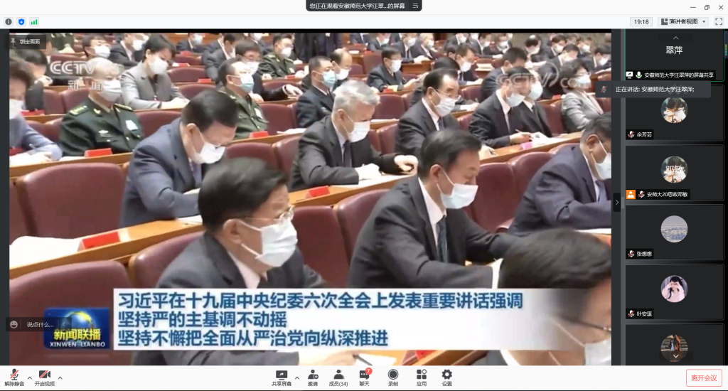 本网讯(文/摄 邓敏)1月29日上午10时,思政研究生党支部通过腾讯会议开展“勇于自我革命,全面从严治党”主题党日活动。此次会议由支部宣传委员汪翠萍主持,支部全体党员同志参加。