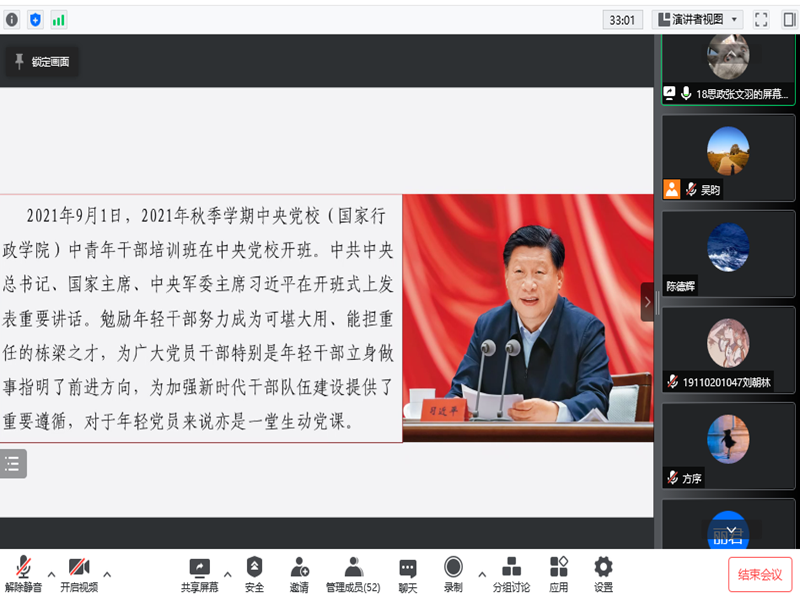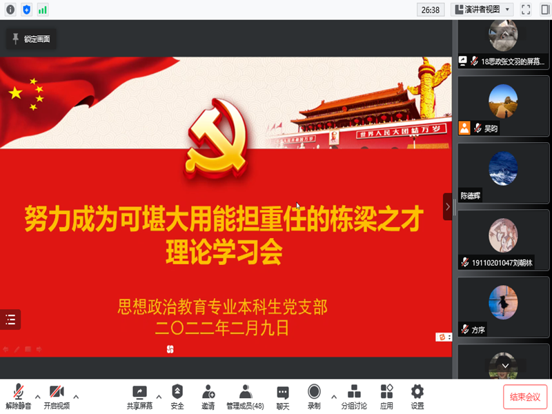 本网讯(文/摄 吴昀)党和人民事业发展需要一代代中国共产党人接续奋斗,必须抓好后继有人这个根本大计。2月9日晚,思想政治教育专业本科生党支部在腾讯会议开展以“努力成为可堪大用能担重任的栋梁之才”为主题的理论学习会。