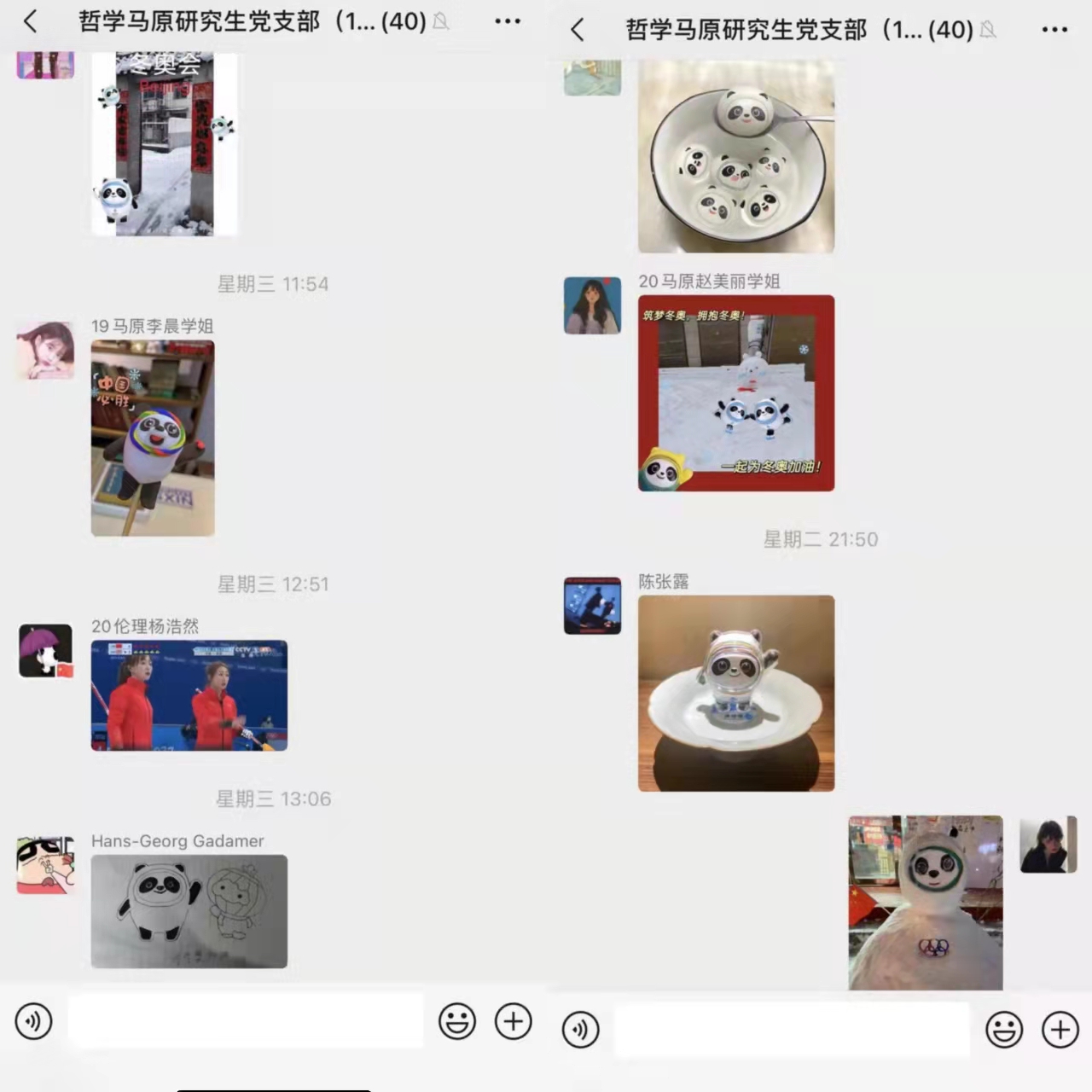 支部党员同志们积极关注冬奥、感悟冬奥力量、投身冬奥实践,自觉担负起了弘扬冬奥精神的时代责任。“‘一起向未来’‘团结就是力量’”、“中国倡导的构建‘人类命运共同体’的理念更加深入人心,中国价值和中国力量得到充分展现。”大家不仅分享了观看冬奥会的心得,而且晒出了自己制作的冬奥吉祥物、参加滑雪运动的照片等。
