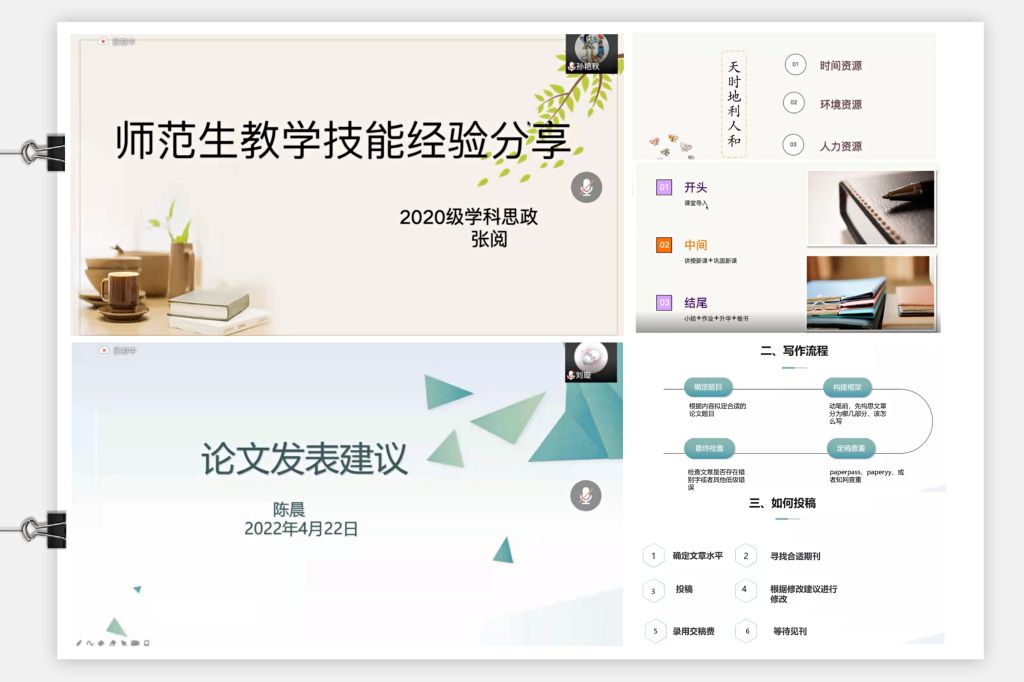 为配合疫情防控的需要,本次经验交流会通过线上渠道开展,支部宣传委员刘璇主持,支部的党员、入党积极分子以及2021级学科教学(思政)全体研究生参加。