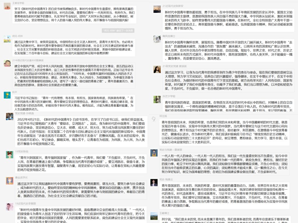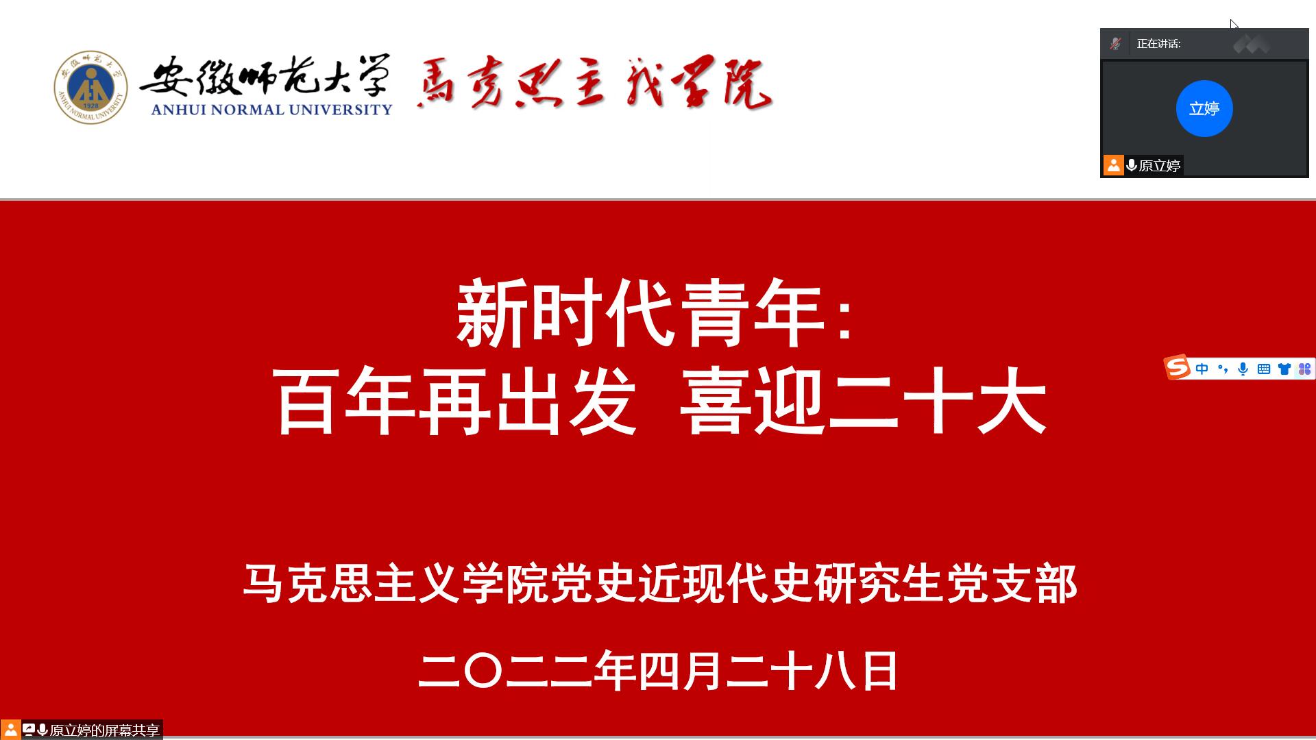 本网讯(文/图 张腾飞)4月28日晚,党史近现代史研究生党支部在腾讯会议开展“新时代青年:百年再出发、喜迎二十大”主题党日活动。此次会议由支部书记陶娴静主持,支部全体党员同志参加。