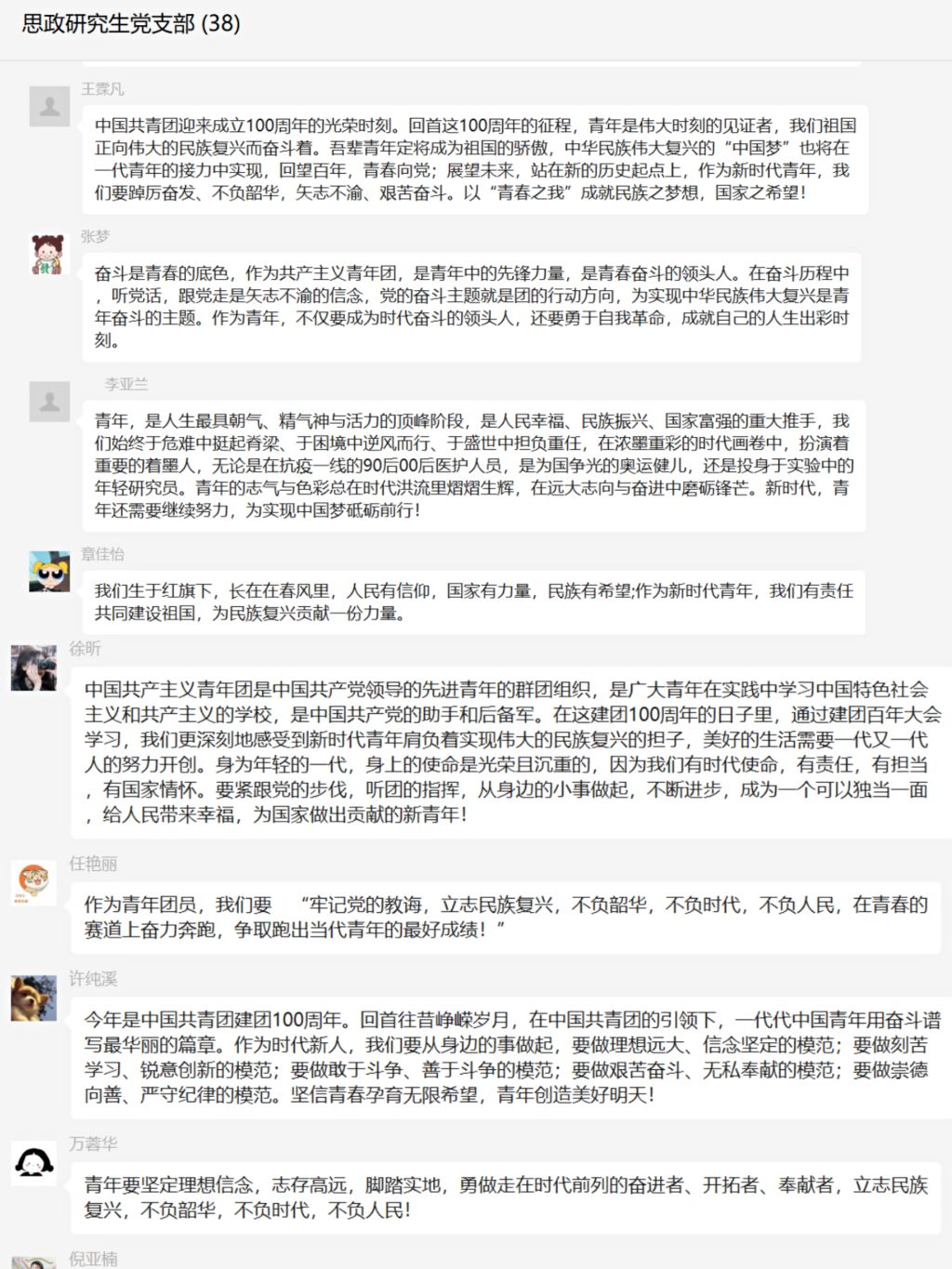 通过此次学习,促进了党支部学习的积极性,支部全体党员回顾了共青团百年奋斗的初心,表示必将以行动践行铿锵的誓言,心有大我,把个人奋斗融入民族复兴的时代洪流中,与时代同步伐,与祖国共命运,与人民共奋斗,以优异成绩献礼建团100周年。