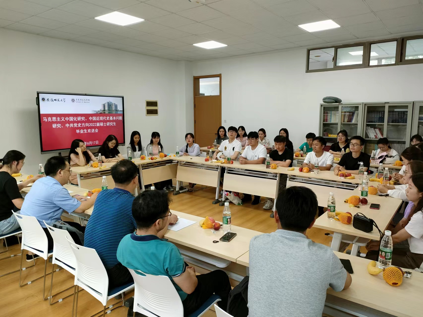 栀子花开,离歌声起。6月17日下午,公司马克思主义中国化研究、中国近现代史基本问题研究、中共党史硕士学位点在学苑南楼9号楼107党史教研室共同举办2022届硕士研究生毕业欢送会,会议由党史教工支部书记沈燕培主持,公司经理姚宏志、各学位点点长、导师代表和全体毕业生共同参加。