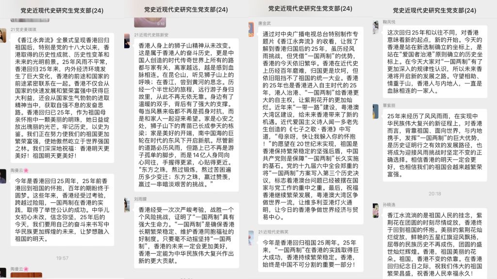 二十五载栉风沐雨,二十五载春华秋实。在观看专题片后,支部党员在支部微信群用拍摄视频、撰写学习心得的方式分享个人体悟,并表达对祖国和香港的美好祝愿。期待香港在国家波澜壮阔的发展大潮中积极展现新的作为,在新的起点上再创新辉煌!