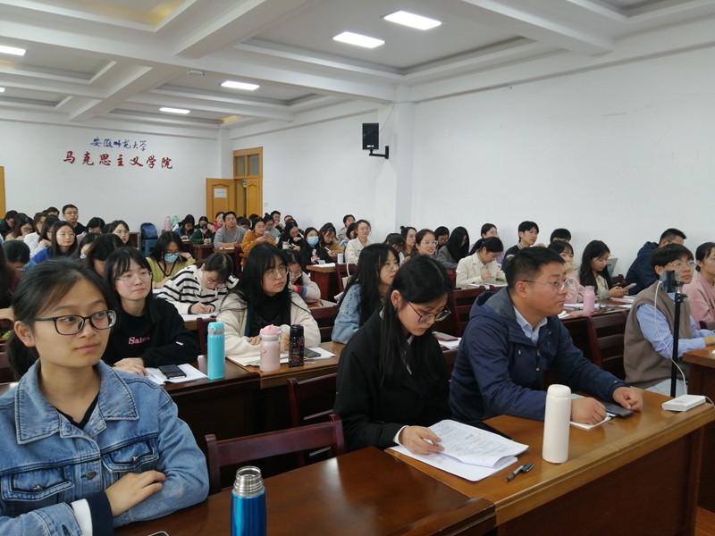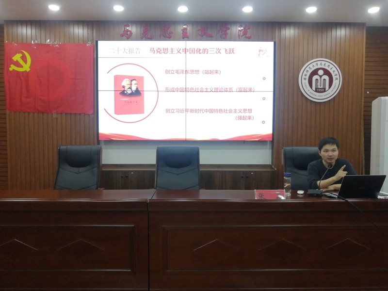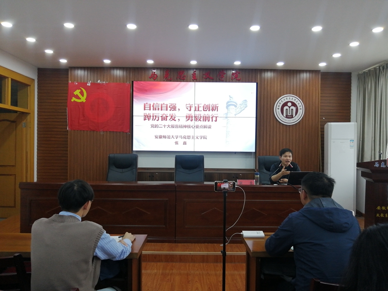 张鑫介绍了中国共产党第二十次全国代表大会的召开时间、地点、会期、参加会议情况,并通过比较党的二十大报告与党的十九大报告的结构篇章和关键词词频相对水平,引出并强调大会主题:高举中国特色社会主义伟大旗帜,全面贯彻习近平新时代中国特色社会主义思想,弘扬伟大建党精神,自信自强、守正创新,踔厉奋发、勇毅前行,为全面建设社会主义现代化国家、全面推进中华民族伟大复兴而团结奋斗。他通过解读习近平总书记关于中国共产党过去五年的工作和新时代十年的伟大变革的重要论述,形象地概括了十年来党和人民经历的三件大事,一是迎来中国共产党成立一百周年,二是中国特色社会主义进入新时代,三是完成脱贫攻坚、全面建成小康社会的历史任务,实现第一个百年奋斗目标。他指出习近平新时代中国特色社会主义思想是当代中国马克思主义、21世纪的马克思主义,并对全体党员提出要求,希望与会党员在日常的工作与学习中,坚持习近平新时代中国特色社会主义思想,坚持问题导向,做一名合格的中共党员。