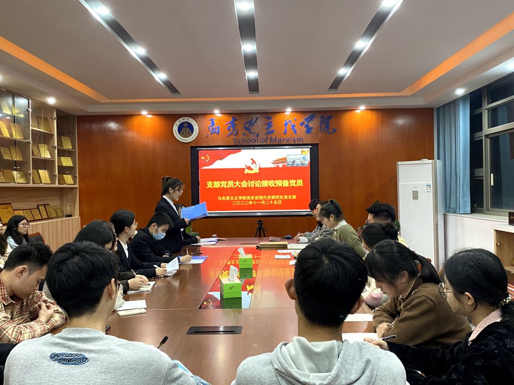 11月25日晚,党史近现代史研究生党支部在公司一楼展厅召开支部大会,讨论接收郑玥等4名同志为预备党员的相关事宜。公司党委委员、副经理李祥兴莅临指导。会议由支部书记陶娴静主持,全体党员同志参加。