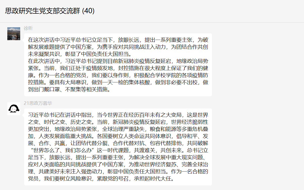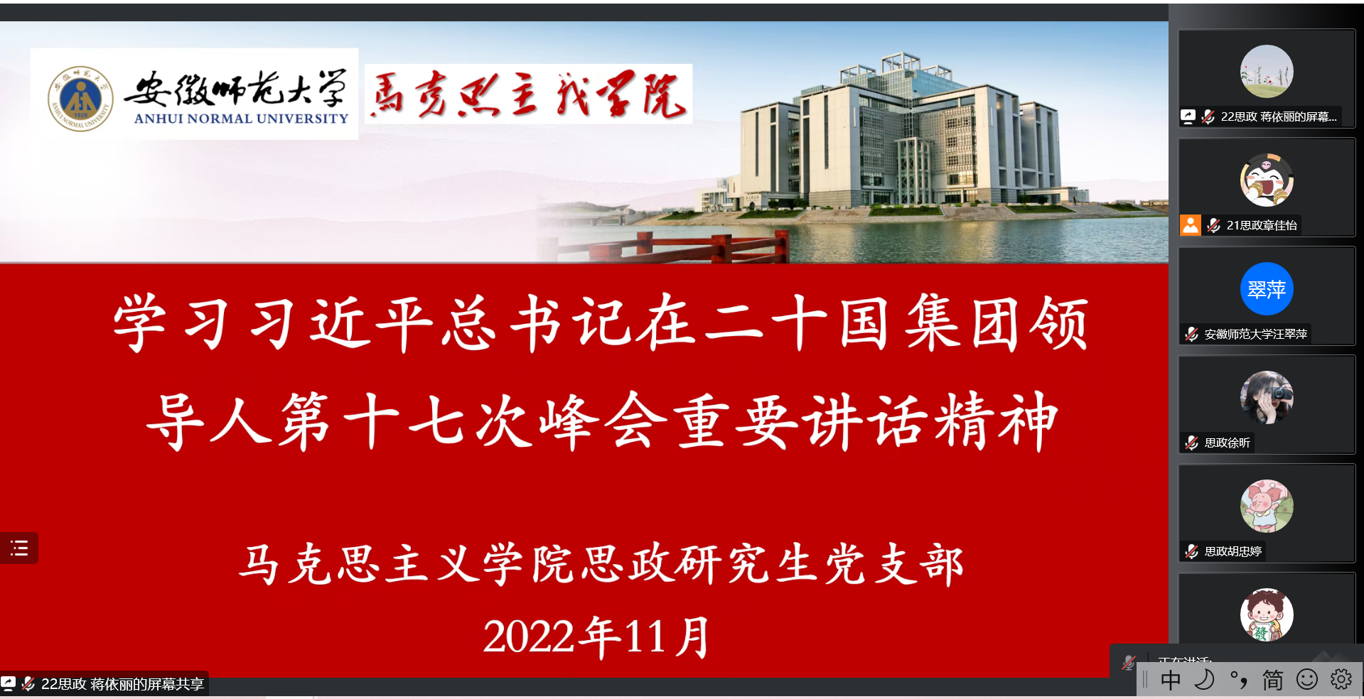 11月29日晚,思政研究生党支部在线开展“两个全球倡议 描绘光明愿景”——学习习近平总书记在二十国集团领导人第十七次峰会上的重要讲话精神主题党日活动。本次活动由支部宣传委员章佳怡主持,支部全体党员同志参加。