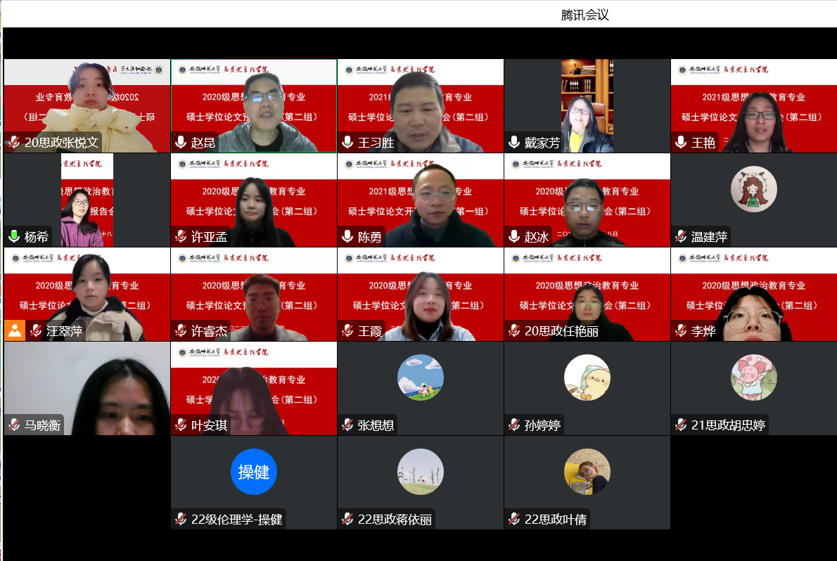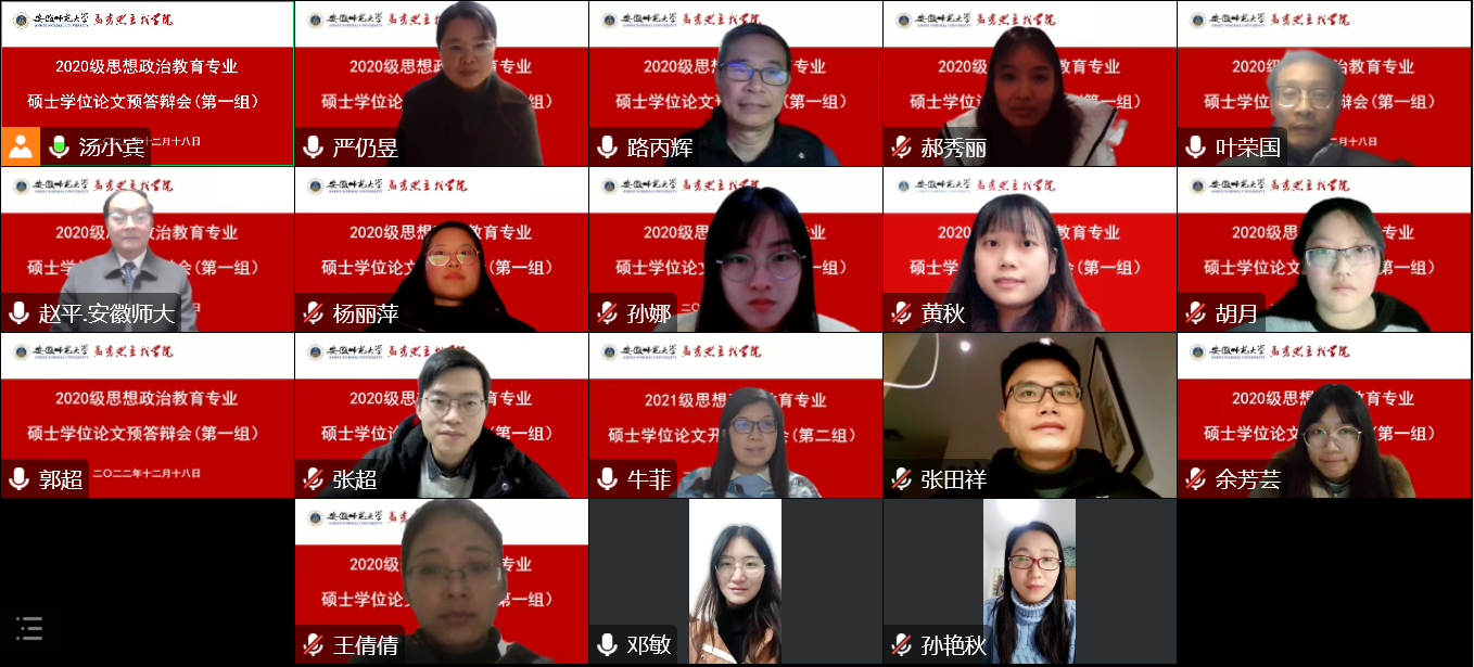 本网讯(2020级研究生 张超)12月18日下午,beet365思想政治教育硕士点2020级思想政治教育专业硕士研究生毕业论文预答辩会顺利举行,会议使用腾讯会议线上方式分两组同时进行。第一组由安庆师范大学严仍昱教授担任预答辩委员会主席,路丙辉教授、赵平教授、叶荣国副教授、牛菲副教授、孙艳秋副教授、郭超副教授、朱琳副教授担任答辩委员。第二组由曲阜师范大学赵昆教授担任预答辩委员会主席,王习胜教授、王艳教授、戴家芳教授、赵冰副教授、杨希副教授、陈勇副教授担任答辩委员。学位点2021级、2022级全体研究生线上观摩学习。