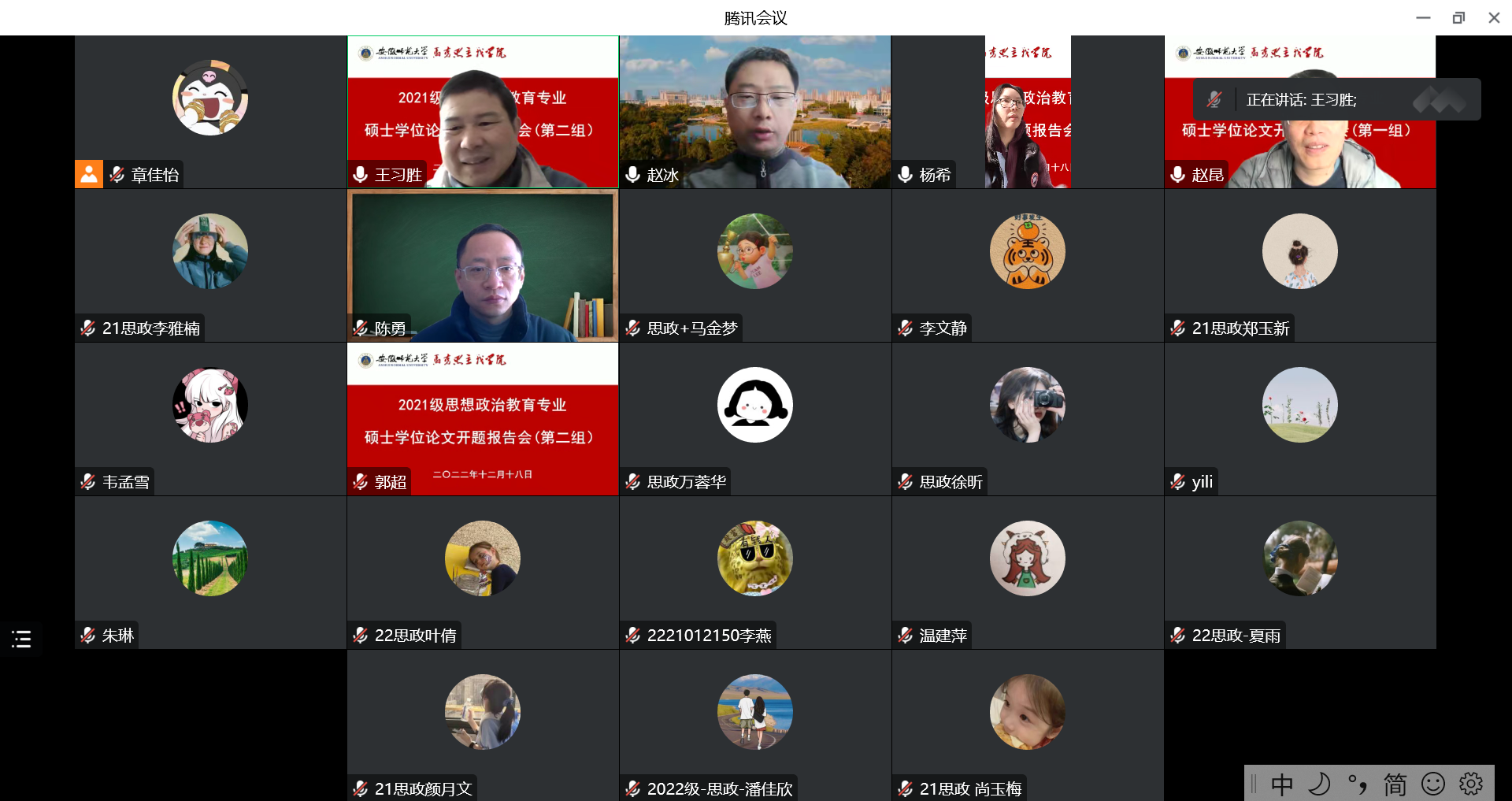 本网讯(2021级研究生 赵兵)12月18日上午,2021级思想政治教育专业硕士学位论文开题报告会通过腾讯会议方式在线上顺利举行。本次开题报告会分为两组同时进行,第一组由曲阜师范大学赵昆教授、公司王习胜教授、戴家芳教授、赵冰副教授、杨希副教授、陈勇副教授、朱琳副教授、郭超副教授与会点评;第二组由安庆师范大学严仍昱教授、公司路丙辉教授、赵平教授、王艳教授、叶荣国副教授、牛菲副教授、孙艳秋副教授与会点评。